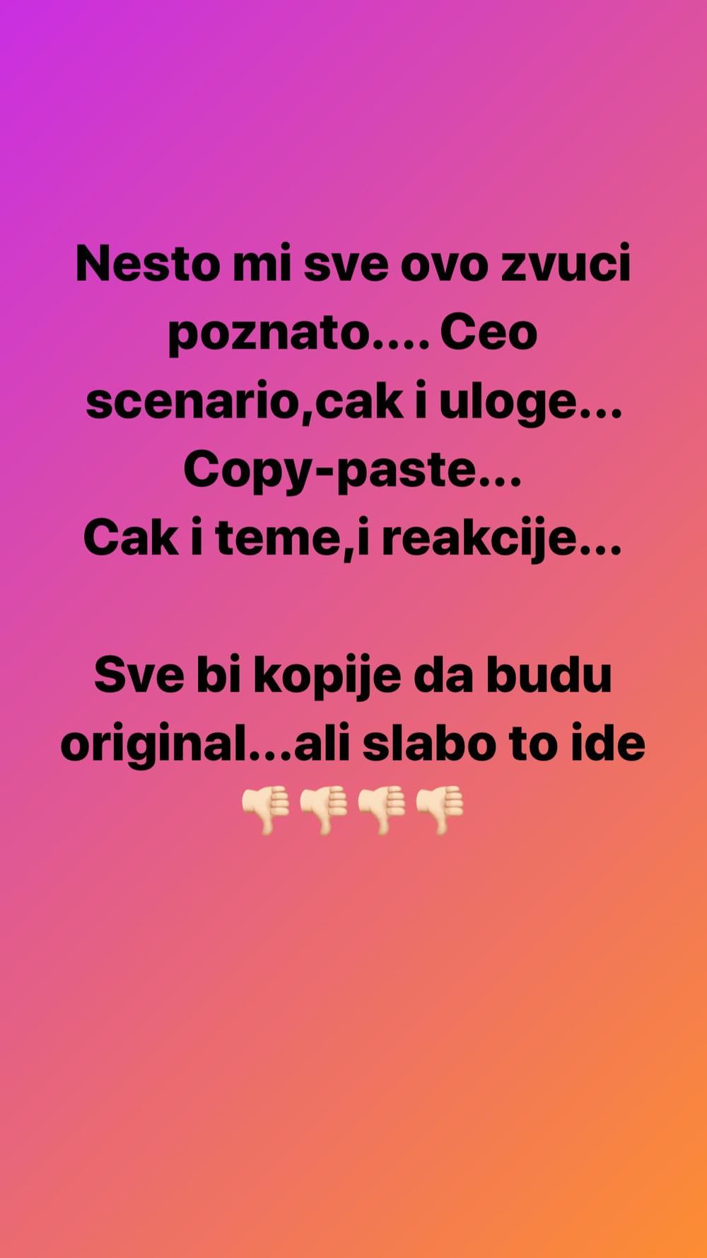 (Espreso.co.rs) – Nešto mi sve ovo zvuči poznato... Ceo scenario, čak i uloge...Copy-paste... Čak i teme, i reakcije... Sve bi kopije da budu original... ali slabo to ide - poručila je Ljuba na svom profilu.