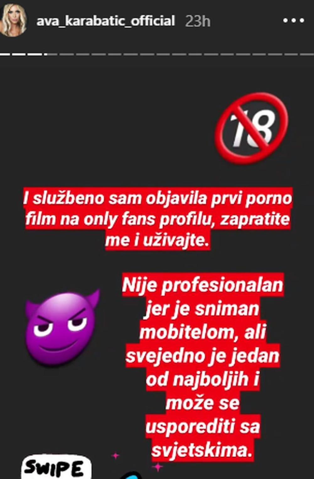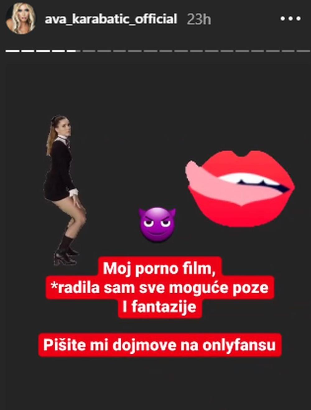 Ava Karabatić odlučila je da unovči svoj izgled i da na jednom popularnom sajtu prodaje svoje nage fotografije, a sada je voditeljka i starleta obavestila svoje pratioce na Instagramu da je nakon nagovora mnogih snimila svoj prvi p*rno film.