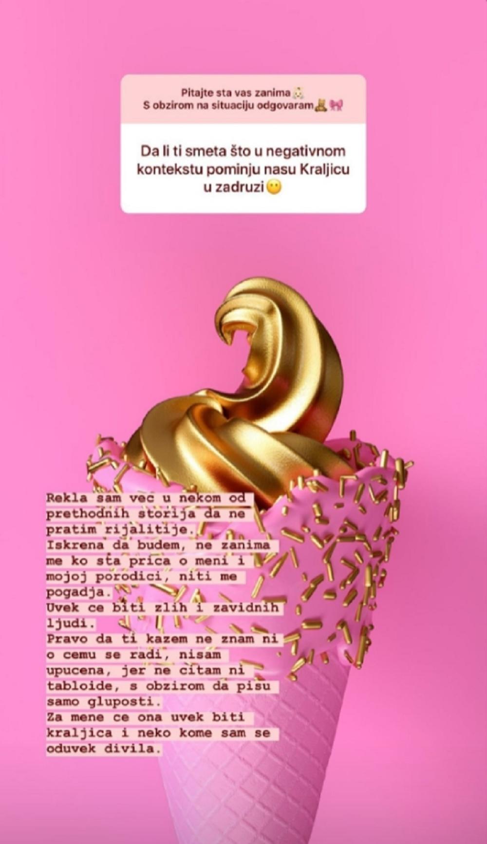 - Rekla sam već u nekom od prethodnih storija da ne pratim rijalitije. Iskrena da budem ne zanima me ko šta priča o meni i mojoj porodici, niti me pogađa. Uvek će biti zlih i zavidnih ljudi. Pravo da ti kažem, ne znam ni o čemu se radi, nisam ni upućena, jer ne čitam tabloida, obzirom da pišu samo gluposti. Za mene će ona zauvek biti kraljica i neko kome sam se oduvek divila - napisala je Mia Pajčin ka kontu čestog pominjana imena njene sestre Ksenije Pajčin u rijalitiju.