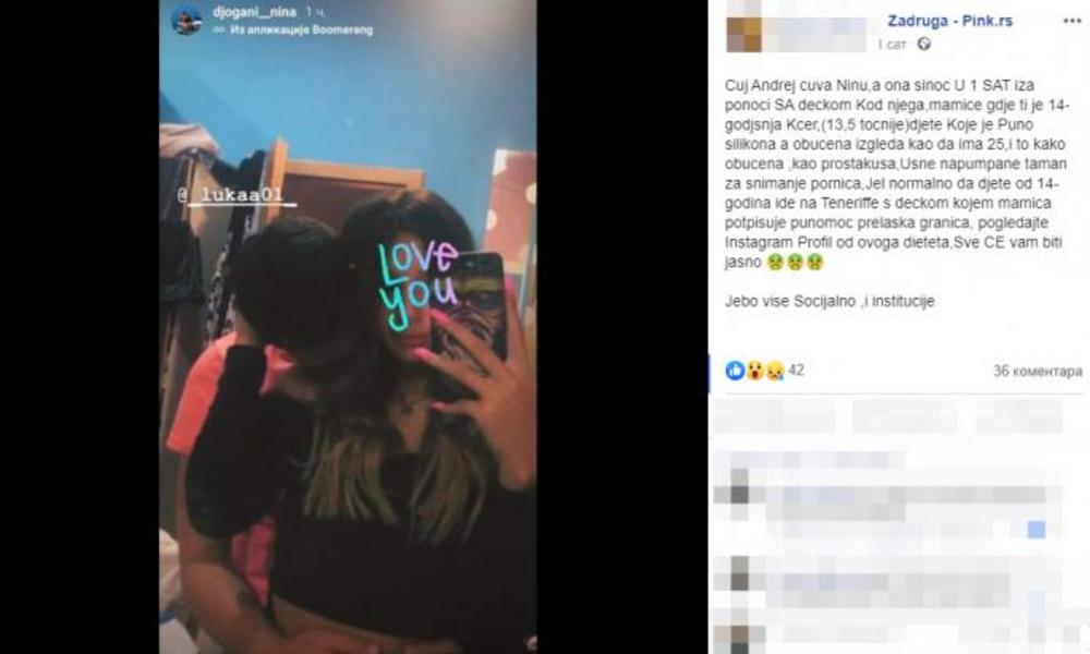 - Čuj, Andrej čuva Ninu, a ona sinoć u 1 sat iza ponoći sa dečkom kod njega. Mamice, gde ti je 14 - ogodišnja kćer (13,5 tačno). Dete, koje je puno silikona, obučena, a izgleda kao da ima 25 i to kako obučena, kao prostakuša. Jel' normalno da dete od 14 godina ide na Tenerife sa dečkom, kojem mamica potpisuje punomoć prelaska granica - pisalo je u opisu Ninine fotografije sa dečkom koju je objavila na svom Instagram profilu, a fanovi objavili na oficijalnu Fejsbuk stranicu "Zadruge".