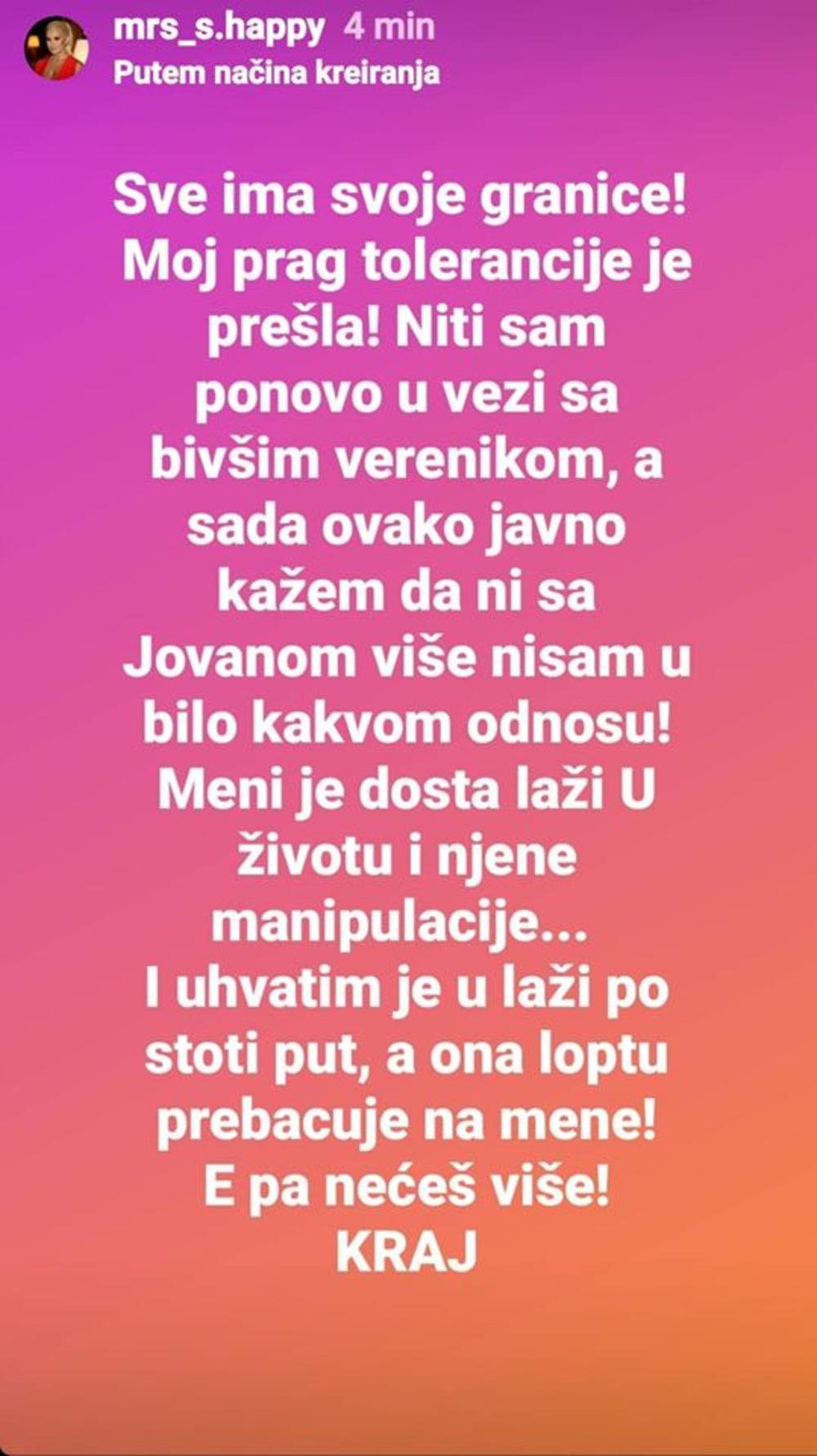 – Sve ima svoje granice! Moj prag tolerancije je prešla! Niti sam ponovo u vezi sa bivšim verenikom, a sada ovako javno kažem da ni sa Jovanom više nisam u bilo kakvom odnosu! Meni je dosta laži u životu i njene manipulacije... I uhvatim je u laži po stoti put, a ona loptu prebacuje na mene! E, pa nećeš više! Kraj! - poručila je Sanja javno.