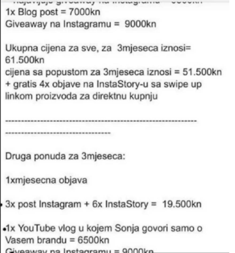 Objava na Instagramu košta 1.200 evra, a ukupna cena za celi "paket" usluga za tri meseca vredi 8.200 evra, odnosno 6.950 evra sa popustom (vrednost kuna u odnosu na 2018, prim.nov)