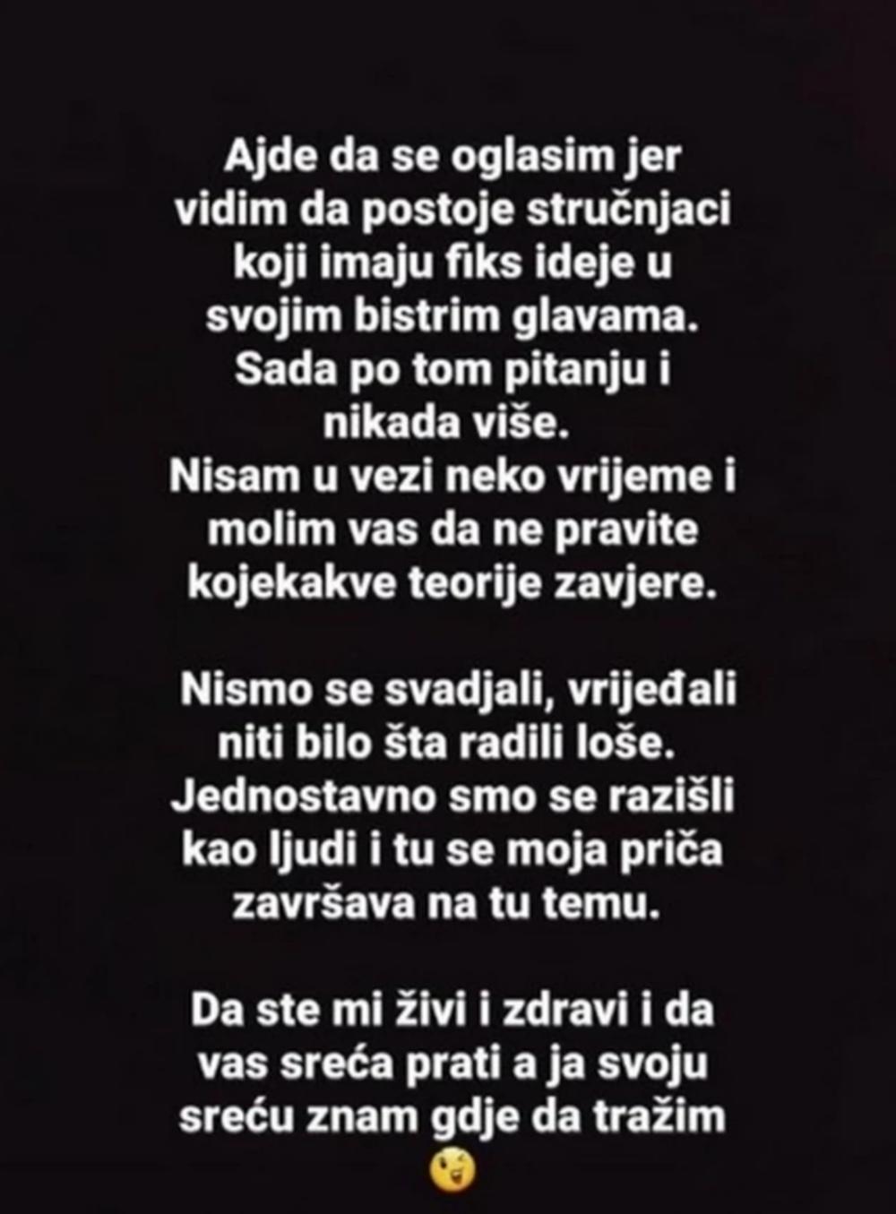 "Hajde da se oglasim jer vidim da postoje stručnjaci koji imaju fiks ideje u svojim bistrim glavama. Sada po tom pitanju i nikada više. Nisam u vezi neko vreme i molim vas da ne pravite koje kakve teorije zavere. Nismo se svađali, vređali niti bilo šta radili loše. Jednostavno smo se razišli kao ljudi i tu se moja priča završava na tu temu. Da ste mi živi i zdravi i da vas sreća prati, a ja svoju sreću znam gde da tražim", napisao je misteriozni Tomović.
