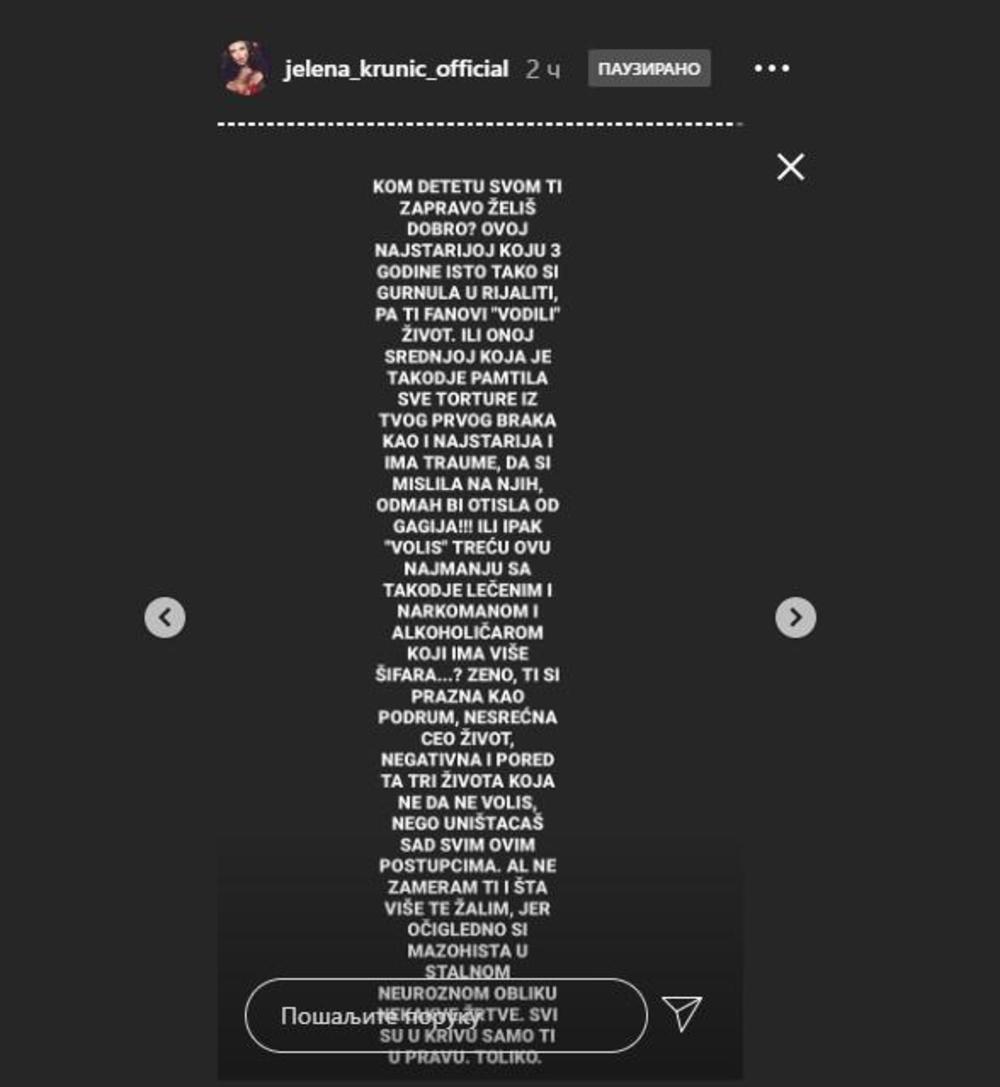 - Kom detetu svom ti zapravo želiš dobro? Ovoj nastarijoj koju 3 godine isto tako si gurnula u rijaliti, pa ti fanovi vodili život. Ili onoj srednjoj, koja je takođe pamtila sve torture iz tvog prvog braka, kao i najstarija, ima traume. Da si mislila na njih odmah bi otišla od Gagija! Ili ipak voliš treću ovu najmanju sa takođe lečenim i narkomanom i alkoholičarom, koji ima više šifara? Ženo, ti si prazna kao podrum nesrećna ceo život, negativna i pored ta tri života, koja ne da ne voliš, nego uništavaš, sad svim ovim postupcima. Ali ne zameram ti, šta više te žalim, jer očigledno si mazohista u stalnom nepoznatom obliku nekakve žrtve. Svi su u krivu, samo ti si u pravu. Toliko. - završava Jelena Krunić na svom instagram storiju.