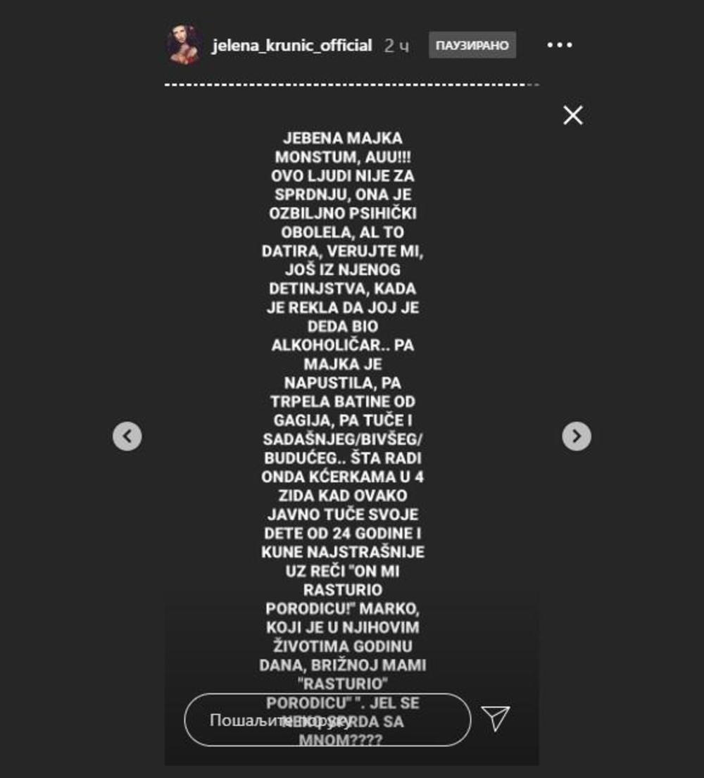 - J*bena majka monstrum, auu! Ovo ljudi nije za sprdnju, ona je ozbiljno psihički obolela, verujte mi, to datira, još iz njenog detinjstva, kada je rekla da joj je deda bio alkoholičar... Pa majka je napustila, pa trpela batine od Gagija, pa tuče i sadašnjeg/bivšeg/budućeg... Šta radi onda ćerkama u 4 zida, kada ovako javno tuče svoje dete od 24 godine i kune najstrašnije uz reči: "On mi je rasturio porodicu!" Marko, koji je u njihovim životima godinu dana, brižnoj mami "rasturio porodicu", jel' se neko sprda samnom? - napisala je Jelena u prvom Instagram storiju, pa dodala: