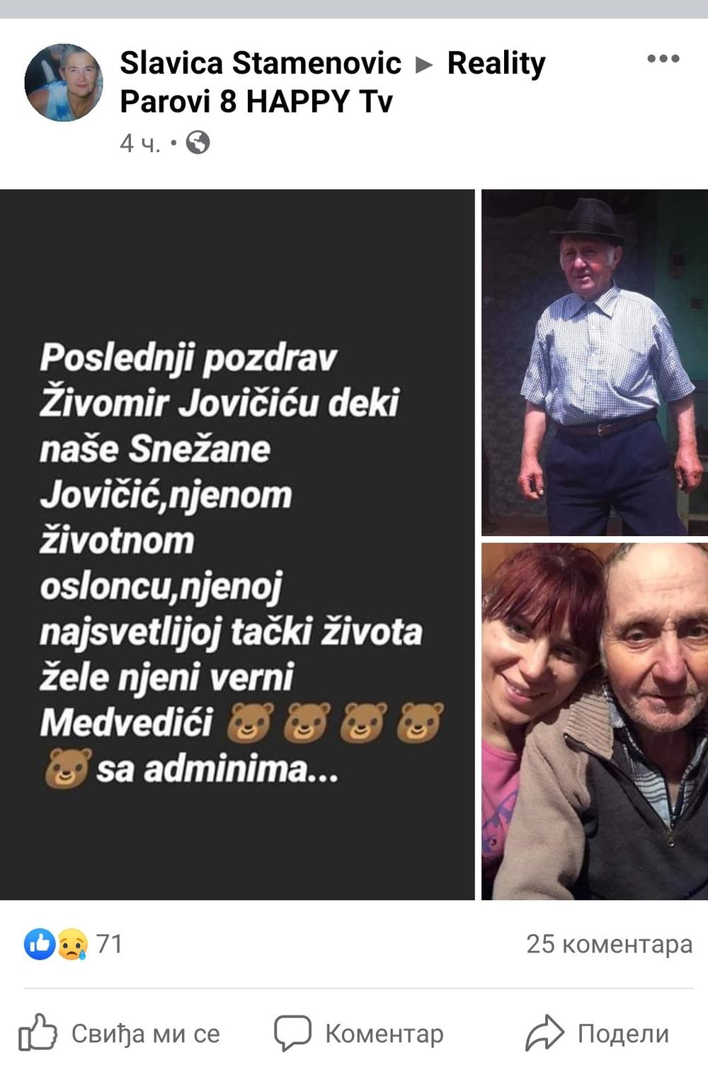 Naime, voditeljka Jovana saopštila je gledaocima, ali i učesnicima da je preminuo deda od Snežane Jovičić.