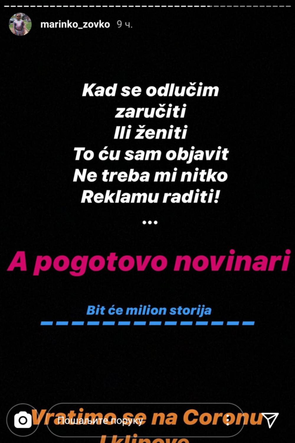 - Kad se odlučim veriti ili oženiti to ću sam obaviti, ne treba mi niko reklamu raditi - napisao je MArinko Zvonko na svom Instagram profilu.