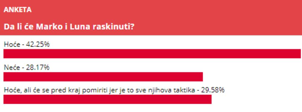 Tokom dana smo postavili anketu pred naše čitaoce sa pitanjem: "Da li će Marko i Luna raskinuti?"
