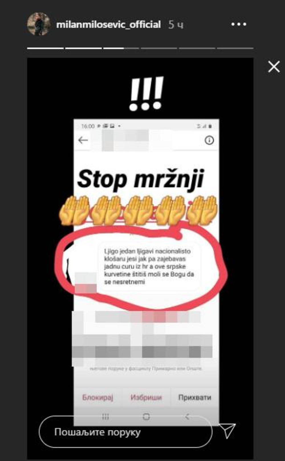 - Ljigo jedan ljigavi, nacionalisto, klošaru, jesi jak pa z*j*bavaš jadnu curu iz Hrvatske, a ove srpske k*rvetine štitiš. Moli se Bogu da se ne sretnemo - glasila je pretnja, koju je objavio Milan na svom Instagram storiju.