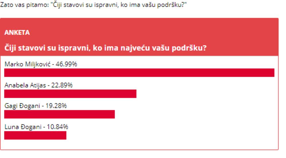 Najveći broj vas stao je na stranu Marka Miljkovića, čak 47%, dok ste najmanje podrške dali Luni, svega 10,9%