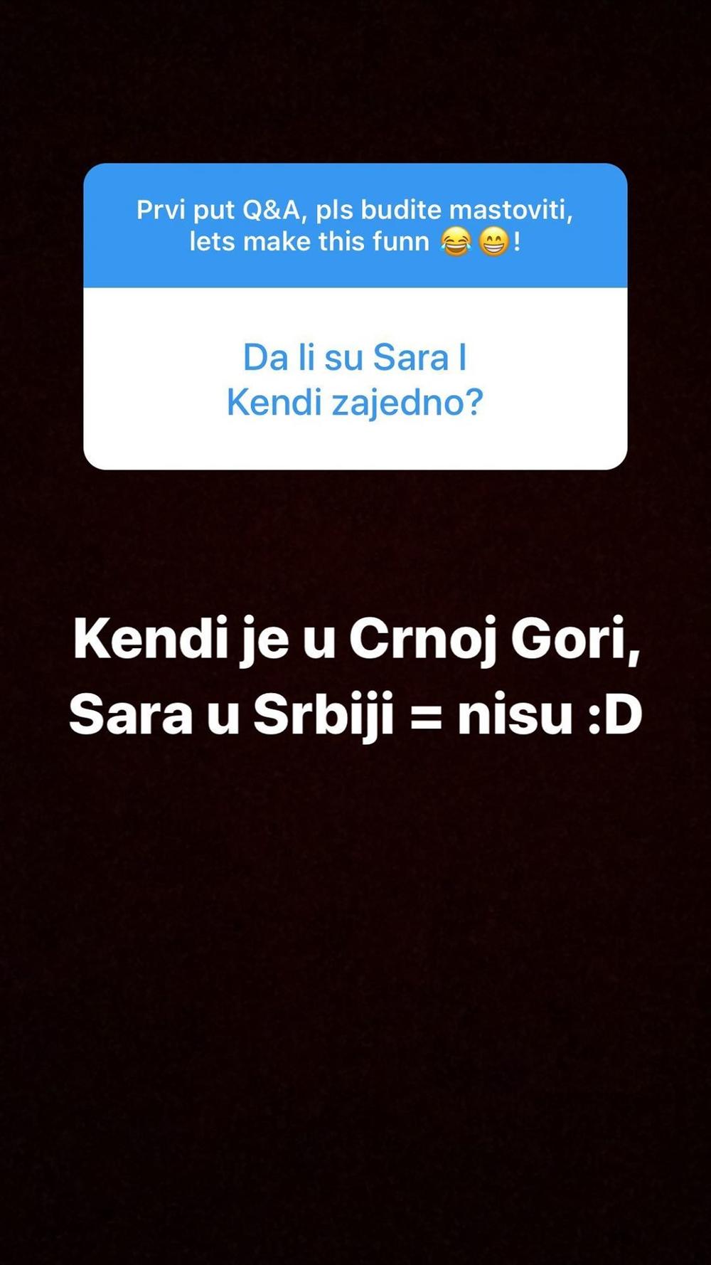 Ovakvim odgovorom, Filip je objasnio da fizički trenutno Sara i Kendi nisu zajedno, a da li između njih postoji nešto više od drugarstva, ostaje pod znakom pitanja.