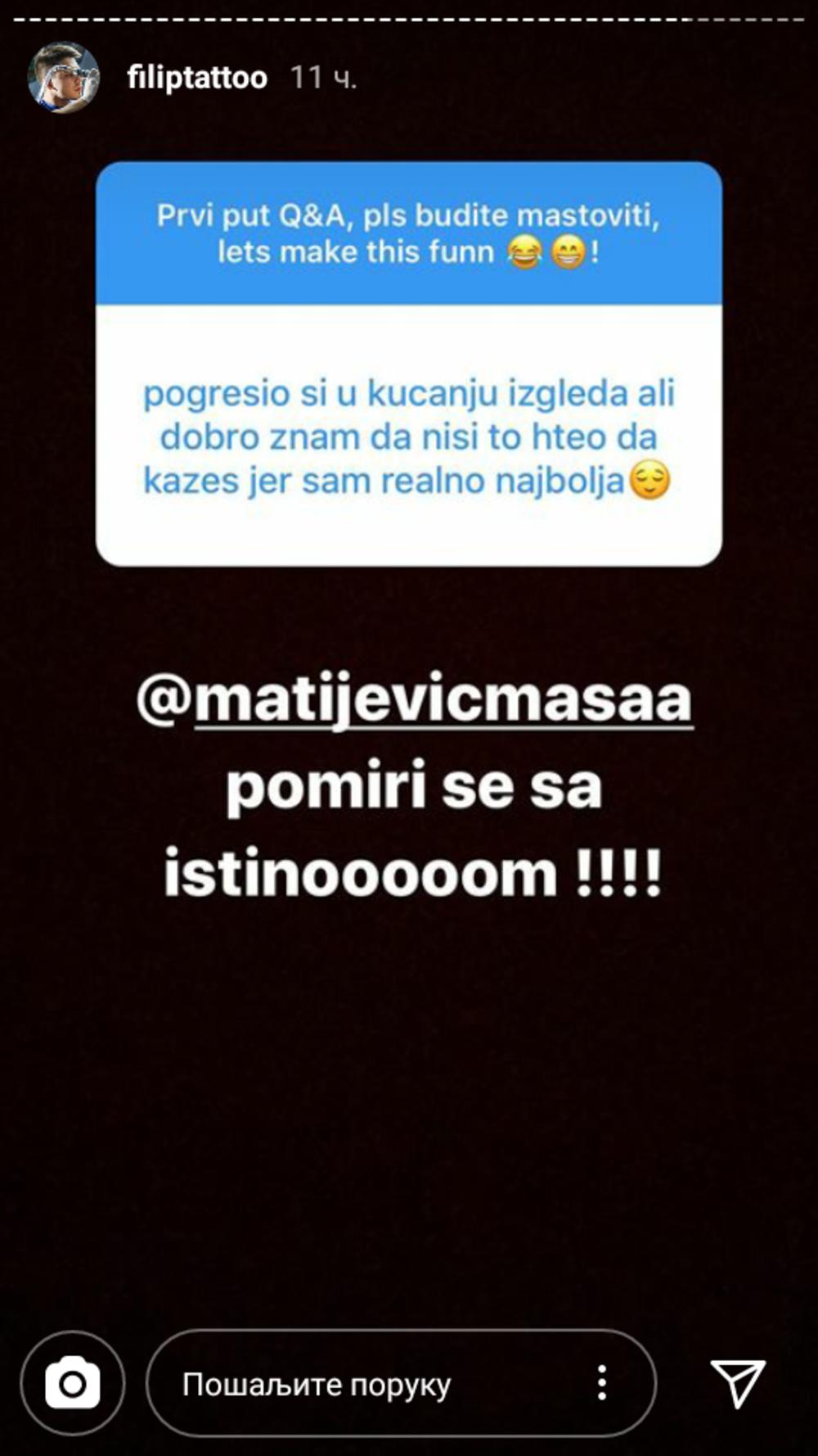 – Pogrešio si u kucanju izgleda, ali dobro znam da nisi hteo to da kažeš jer sam realno najbolja – poručila je Maša Filipu. Na šta je on, očigledno u šaljivom duhu, njoj odgovorio: