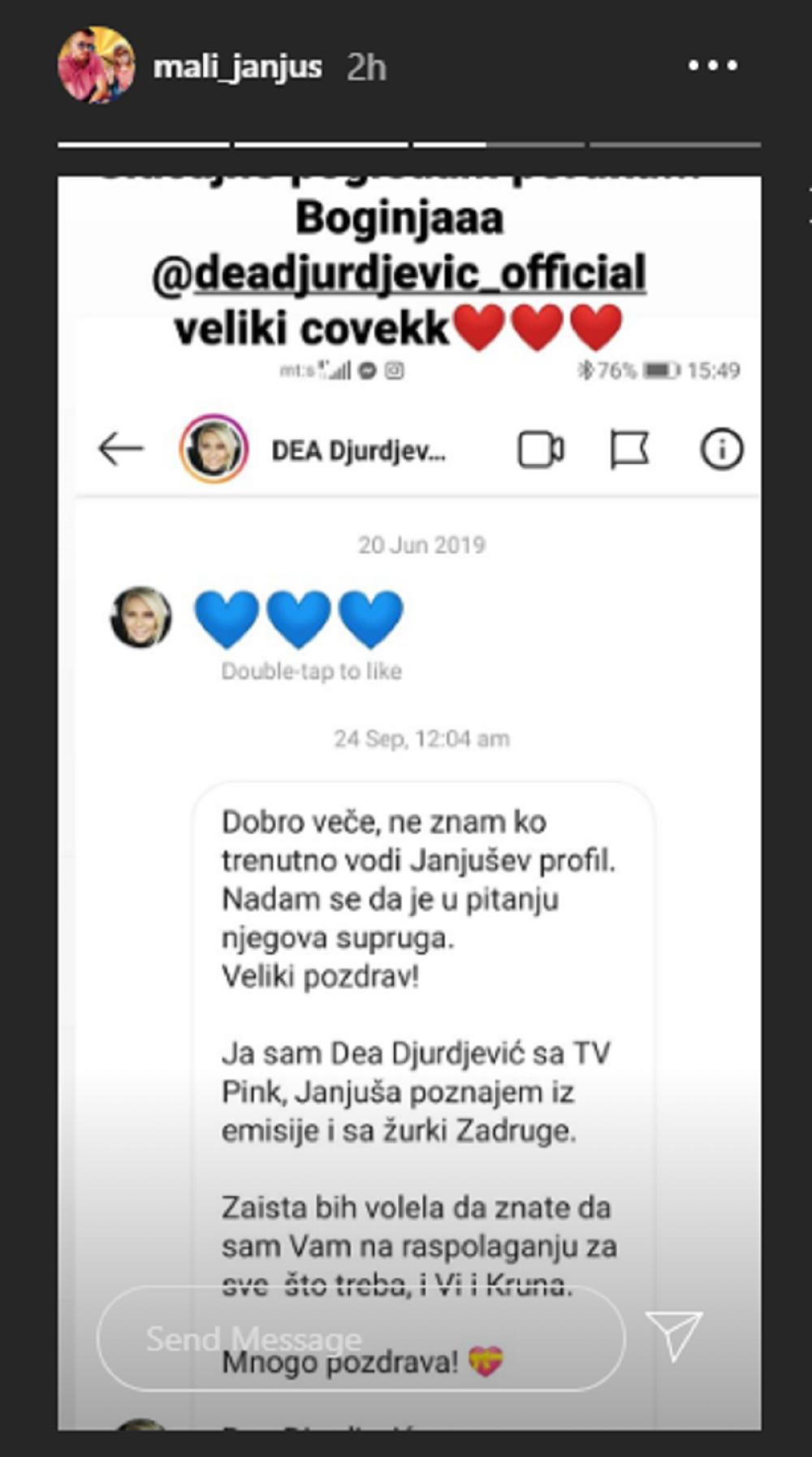 Tako je danas Janjuš pronašao poruke koje je na njegov profil na Instagramu poslala voditeljka Dea Đurđević, koja se obratila njegovoj supruzi Eni i ponudila joj svoju pomoć ukoliko joj bilo šta bude trebalo, misleći da ona vodi njegov profil dok je bivši košarkaš u “Zadruzi".