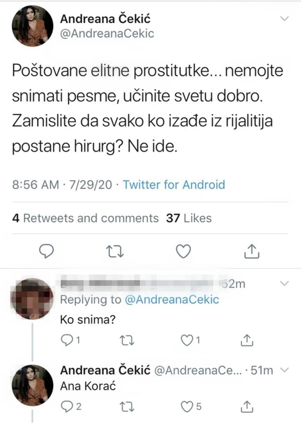 Pevačica Andreana Čekić danas je u toku dana na svom Tviter profilu potkačila Anu Korać nazvavši je elitnom prostitutkom.