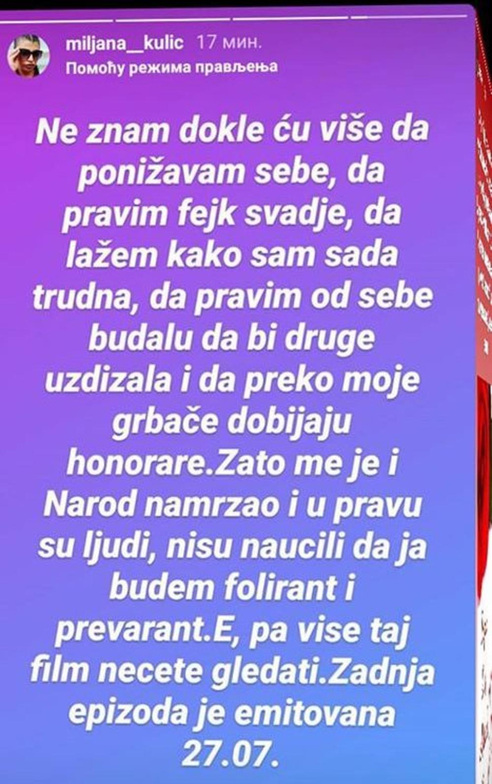 - Ne znam dokle ću više da ponižavam sebe, da pravim fejk svađe, da lažem kako sam sada trudna, da pravim od sebe budalu da bi druge uzdizala i da preko moje grbače dobijaju honorare. Zato me je i narod namrzao i u pravu su ljudi, nisu naučili da ja budem folirant i prevarant. E, pa više taj film nećete gledati. Zadnja epizoda je emitovana 27.07. - poručila je Miljana.