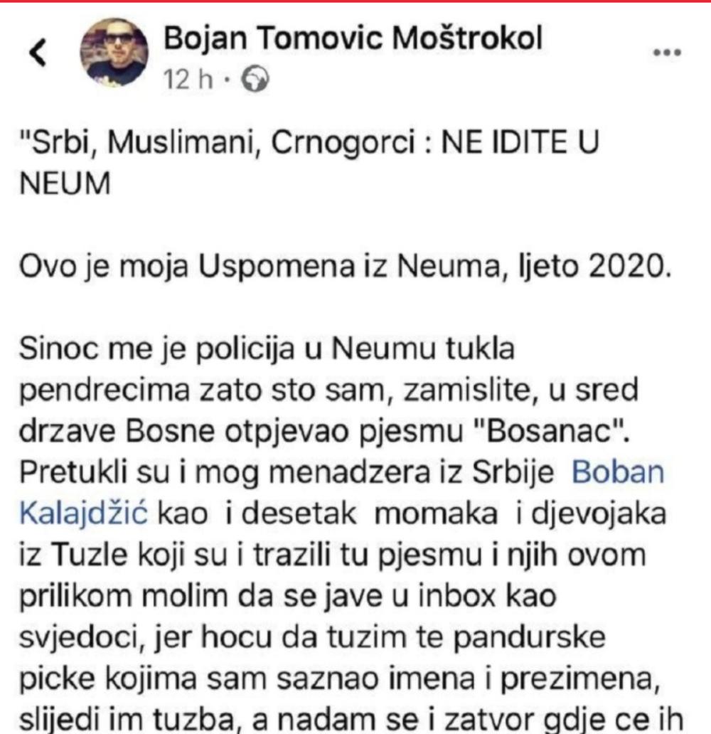 Crnogorski pevač i bivši dečko Miljane Kulić, Bojan Tomović Moštrokol oglasio se na svom Fejsbuk-profilu, porukom upućenom Srbima, Bosancima i Crnogorcima da ne idu u Neum, ističući da ga je policija pretukla samo iz razloga što je otpevao pesmu "Bosanac".