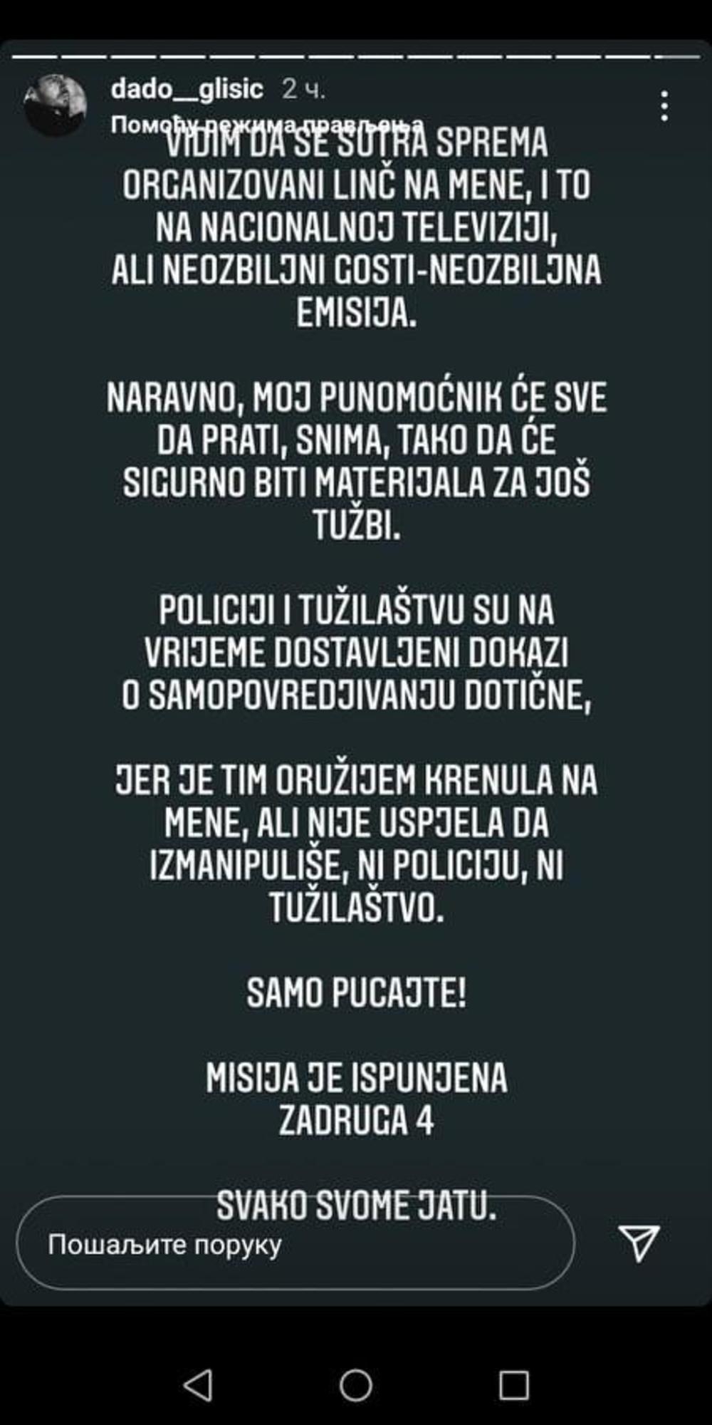 - Vidim da se sutra sprema organizovani linč na mene, i to na nacionalnoj televiziji, ali neozbiljni gosti, neozbiljna emisija. Naravno moj punomoćnik će sve to da prati, snima, tako da će sigurno biti materijala za još tužbi. Policiji i tužilaštvu su na vreme dostavljeni dokazi o samopovređivanju dotične, jer je tim oružijem krenula na mene, ali nije uspela da izmanipuliše ni policiju ni tužilaštvo. Samo pucajte, misija je ispunjena. Zadruga 4, svako svome jatu - napisao je Dado na svom profilu.