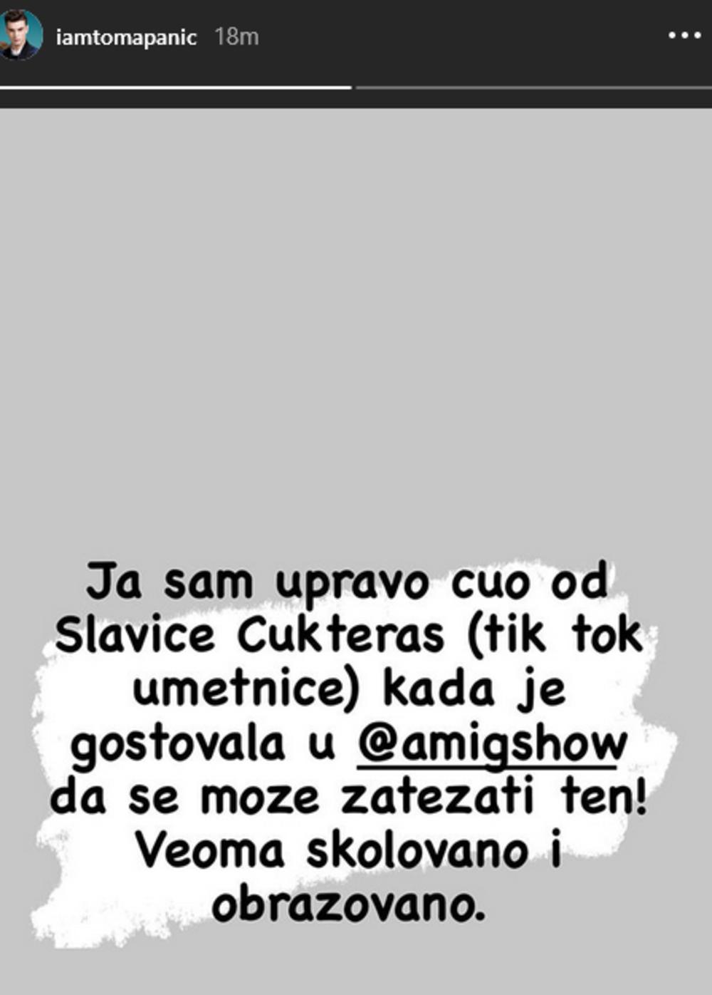 - Ja sam upravo čuo od Slavice Ćukteraš, Tik-Tok umetnice, kada je gostovala u "Amidži šouu", da se može zatezati ten. Veoma školovano i obrazovano - poručio je putem Instagram naloga Toma.