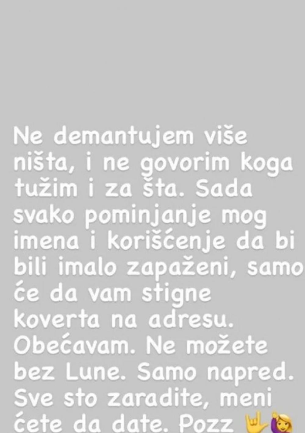 - Ne dematujem više ništa i ne govorim koga tužim i za šta. Sada svako pominjanje mog imena i korišćenje da bi bili malo zapaženi, samo će da vam stigne koverta na adresu. Obećavam. Ne možete bez Lune. Samo napred. Sve što zaradite, meni ćete da date - napisala je Luna na Instagramu.