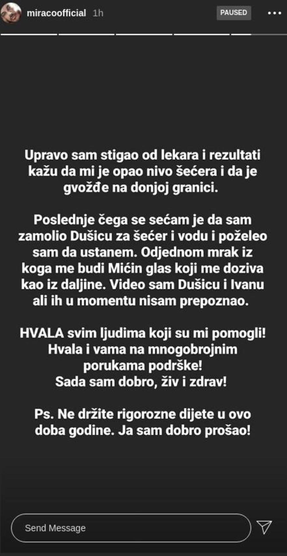 - Upravo sam stigao od lekara i razultati kažu da mi je opao nivo šećera i da je gvožđe na donjoj granici. Poslednje čega se sećam je da sam zamolio Dušicu za šećer i vodu i poželeo sam da ustanem. Odjednom, mrak iz koga me budi Mićin glas koji me doziva kao iz daljine. Video sam Dušicu i Ivanu, ali ih u momentu nisam prepoznao. Hvala svim ljudima koji su mi pomogli! Hvala i vama, mnogobrojnim porukama podrške! Sada sam dobro, živ i zdrav! P.S Ne držite rigorozne dijete u ovo doba godine. Ja sam dobro prošao.