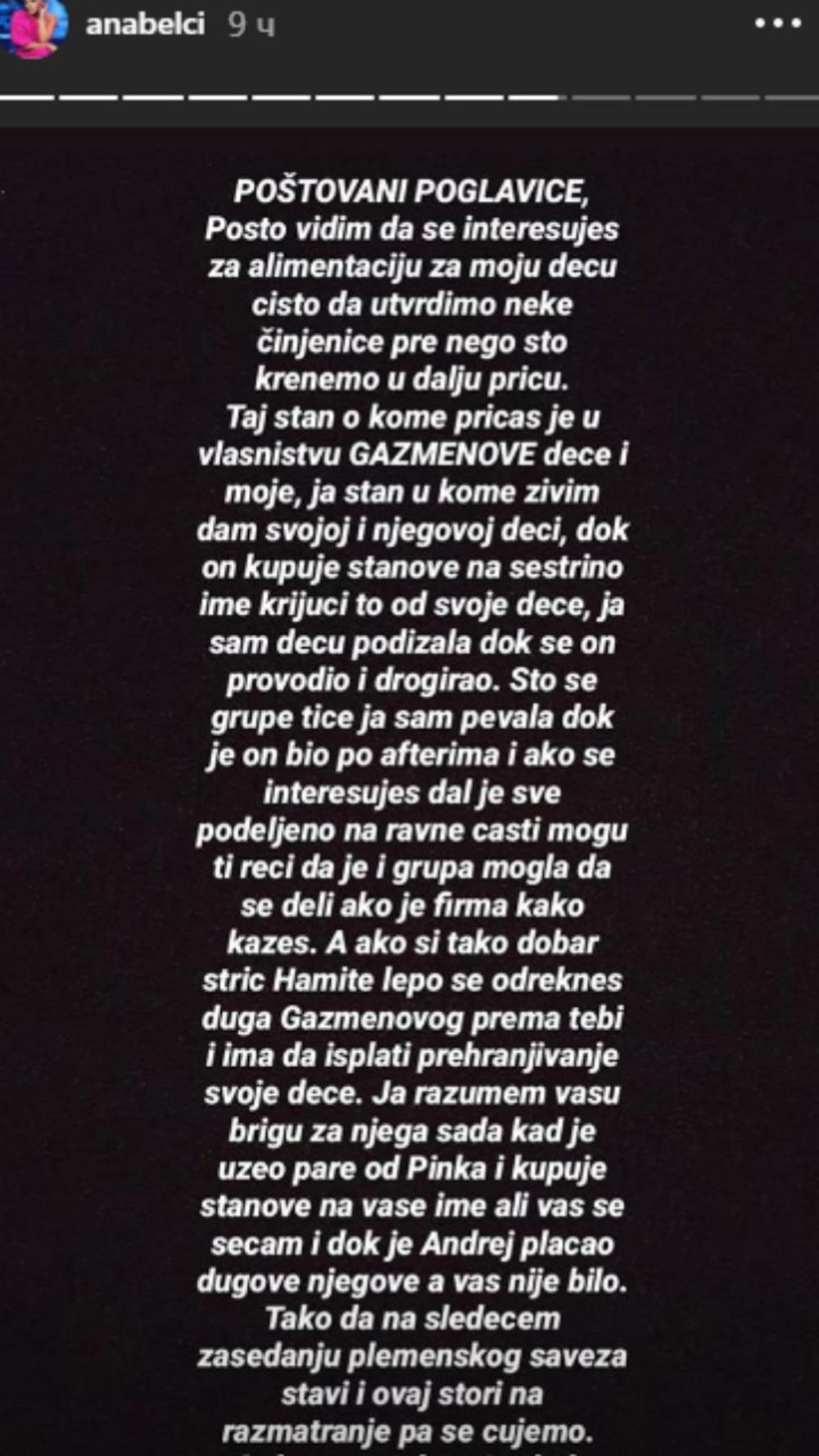 - Poštovani poglavice, pošto vidim da se interesuješ za alimentaciju za moju decu, čisto da utvrdimo neke činjenice pre nego što krenemo u dalju priču. Taj stan o kome pričaš je u vlasništvu Gazmenove dece i moje, ja stan u kome živim dam svojoj i njegovoj deci, dok on kupuje stanove na sestrino ime krijući to od svoje dece, ja sam decu podizala dok se on provodio i drogirao. Što se grupe tiče, ja sam pevala dok je on bio po afterima i ako se interesuješ da li se da li je sve podeljeno na ravne časti, mogu ti reći i da je grupa mogla da se deli ako je firma, kako kažeš. A ako si tako dobar stric, Hamite, lepo se odrekneš duga Gazmenovog prema tebi i ima da isplati prehranjivanje svoje dece. Ja razumem vašu brigu za njega sada kada je uzeo pare od Pinka i kupuje stanove na vaše ima, ali vas se sećam i dok je Andrej plaćao dugove njegove, a vas nije bilo. Tako da na sledećem zasedanju plemenskog saveza stavi i ovaj stori na razmatranje, pa se čujemo. Srdačan pozdrav, Anabela Bukva Atijas - napisala je pevačica.