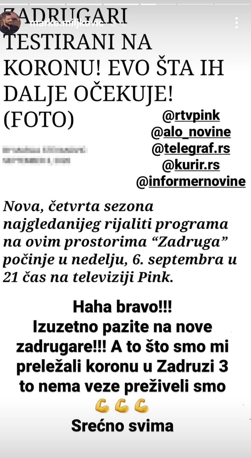 - Bravo, izuzetno pazite na nove zadrugare! A to što smo mi preležali koronu u "Zadruzi 3", to nema veze, preživeli smo. Srećno svima - napisao je Miljković u objavi, a onda je usledio obrt.