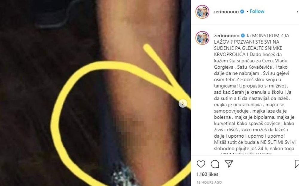 "Ja monstrum? Ja lažov? Pozvani ste svi na suđenje, pa gledajte snimke krvoprolića! Dado, hoćeš da kažem šta si pričao za Cecu, Sašu Kovačevića, i tako dalje, da ne nabrajam... Svi su gejevi osim tebe? Hoćeš sliku tvoju u tangicama? Upropastio si mi život, sad kad je Sarah krenula u školu! Ja da ćutim, a ti da nastavljaš da lažeš, majka je neuračunljiva, majka se samopovređuje, majka laže da je bolesna, majka je bipolarna, majka je k*rvetina! Kako spavaš, čoveče, kako živiš i dišeš, kako možeš da lažeš i dalje i uporno i uporno i uporno! Misliš, ćutaće budala, ne ćutim! Svi slobodno pljujte još 24 sata, nakon toga ne vidim vas više bagro bezobrazna! Ostalima hvala na podršci, a ove psihopate idite njemu na profil i na nastupe, sjašite s mene! I dođite s njima na suđenje, bagro raspala" napisala je ona uz nekoliko fotografija koje je objavila.