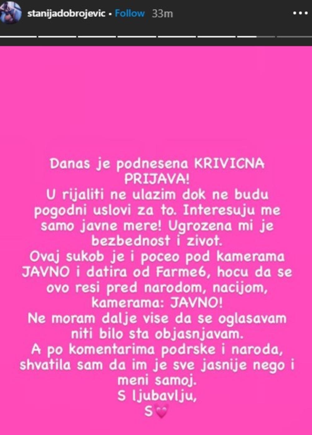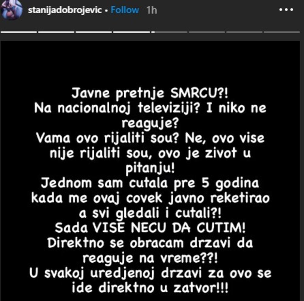 "Direktno se obraćam državi da reaguje na vreme. U svakoj uređenoj državi za ovo se ide direktno u zatvor", napisala je Stanija u svojoj objavi: