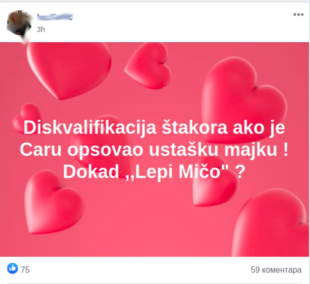 - Diskvalifikacija štakora ako je Caru opsovao ustašku majku! Dokad, Lepi Mićo? - glasi samo jedan od komentara koji se pojavio na Fejsbuk grupama na kojima se okupljaju gledaoci "Zadruge".