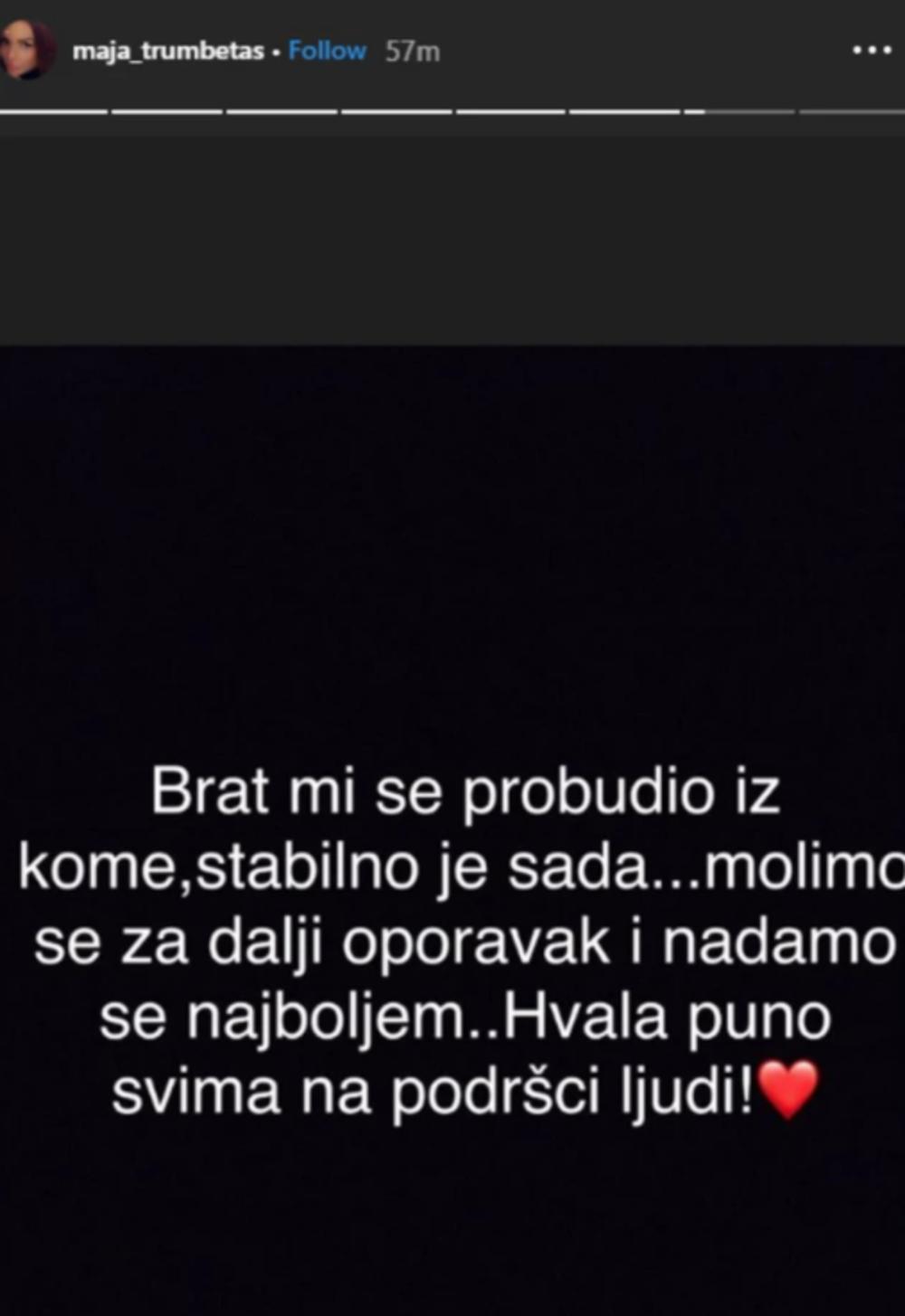 - Brat mi se probudio iz kome, stabilno je sada.. molimo se za dalji oporavak i nadamo se najboljem. Hvala puno svima na podršci, ljudi - napisala je Jovičina sestra.