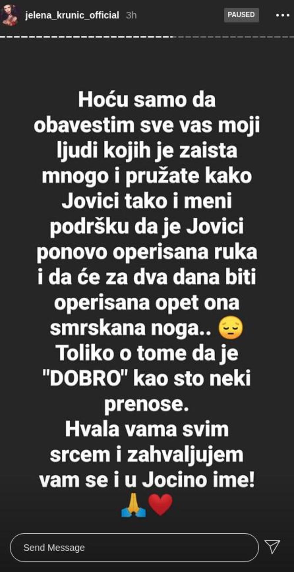 - Hoću samo da obavestim sve vas moji ljudi kojih je zaista mnogo i pružate kako Jovici, tako i meni podršku, da je Jovici ponovo operisana ruka i da će za dva dana biti operisana opet ona smrskana noga. Toliko o tome da je "dobro", kao što neki prenose. Hvala vam svim srcem i zahvaljujem vam se i u Jocino ime - napisala je Krunićka.