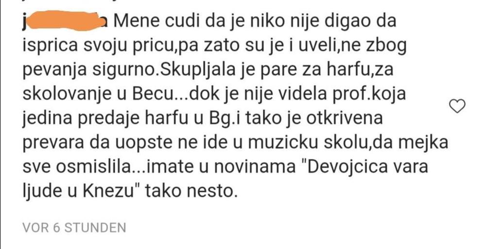 – Mene čudi da je niko nije digao da ispriča svoju priču, pa zato su je i uveli, ne zbog pevanja sigurno. Skupljala je pare za harfu, za školovanje u Beču... dok je nije videla profesorica koja jedina predaje harfu u Beogradu i tako je otkrivena prevara da uopšte ne ide u muzičku školu, da je majka se osmislila.... imate u novinama "Devojčica vara ljude u Knezu" tako nešto - glasi komentar koji je osvanuo na društvenim mrežama.