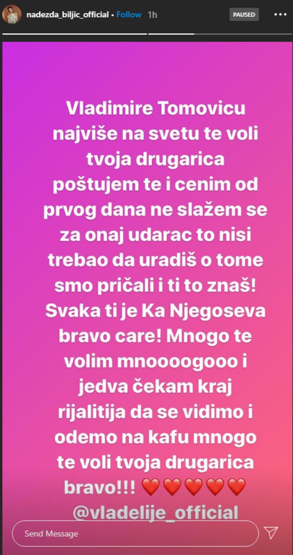- Vladimire Tomoviću, najviše na svetu te voli tvoja drugarica, poštujem te i cenim od prvog dana, ne slažem se za onaj udarac, to nisi trebao da uradiš, o tome smo pričali i ti to znaš. Svaka ti je ka Njegoševa, bravo care! Mnogo te volim, mnogo i jedva čekam kraj rijalitija da se vidimo i odemo na kafu, mnogo te voli tvoja drugarica, bravo! - poručila je Nadežda Tomoviću.