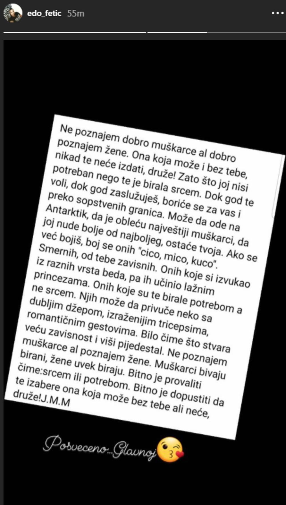 - Ne poznajem dobro muškarce, ali dobro poznajem žene. Ona koja može i bez tebe, nikad te neće izdati, druže! Zato što joj nisi potreban nego te je birala srcem. Dok god te voli, dok god zaslužuješ, boriće se za vas preko sopstvenih granica. Može da ode na Antarktik, da je obleću najveštiji muškarci, da joj nude bolje od najboljeg, ostaće tvoja. Ako se već bojiš, boj se onih "cico, mico, kuco". Smernih, od tebe zavisnih. Onih koje si izvukao iz raznih vrsta beda, pa ih učinio lažnim princezama. Onih koje su te birale potrebom, a ne srcem. Njih može da privuče neko sa dubljim džepom, izraženijim tricepsima, romantičnim gestovima. Bilo čime što stvara veću zavisnost i viši pijadestal. Ne poznajem muškarce, ali poznajem žene. Muškarci bivaju birani, žene uvek biraju. Bitno je dopustiti da te izabere ona koja može bez tebe, ali neće druže - napisao je Edo i dodao: "Posvećeno, glavnoj", a vi sami procenite da li je ovo uputio Zilhi.