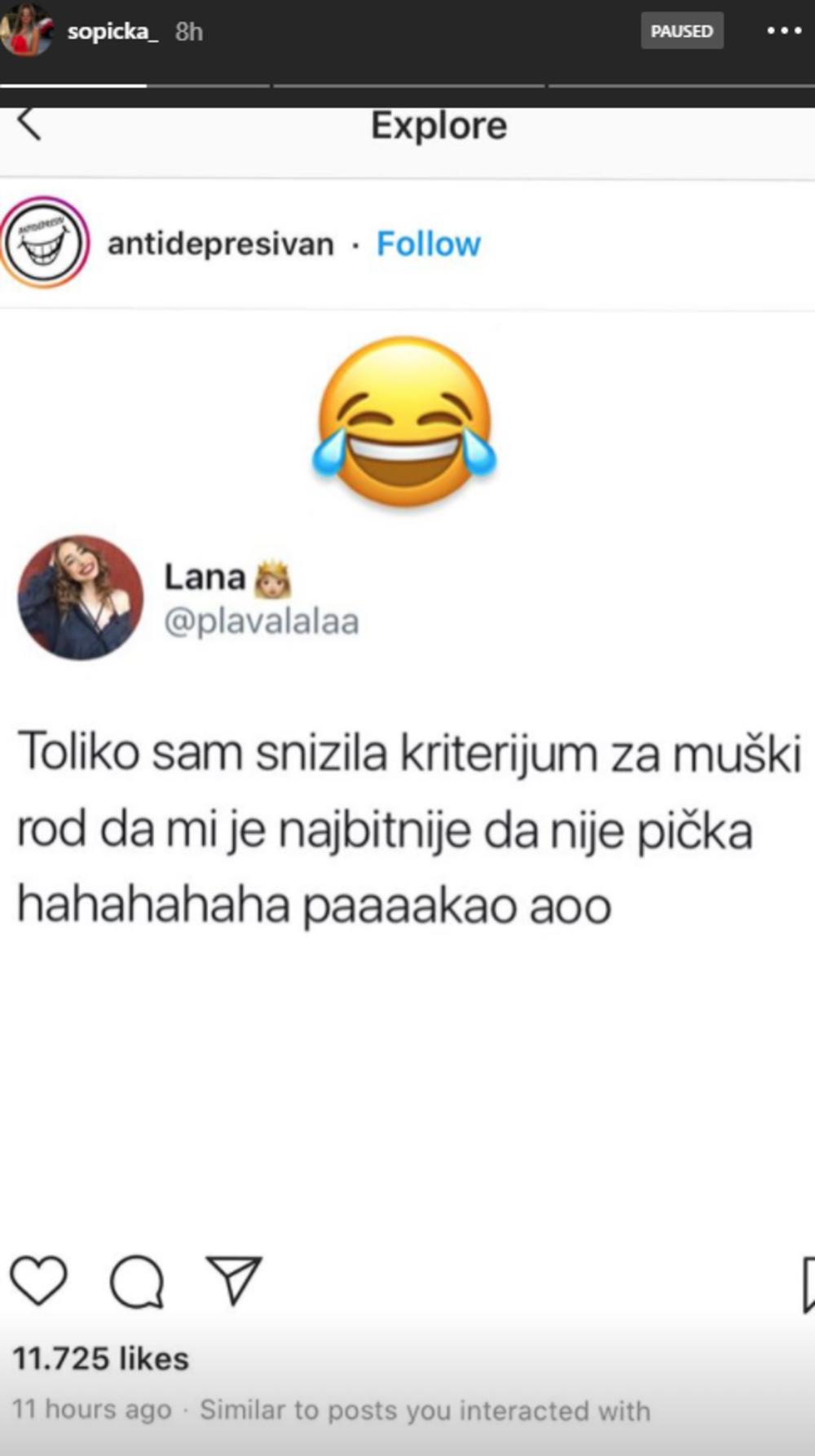 - Toliko sam snizila kriterijum za muški rod da mi je najbitnije da nije p*čka, hahahahaha, pakao,aoo! - podelila je Ivana na svom Instagram profilu.