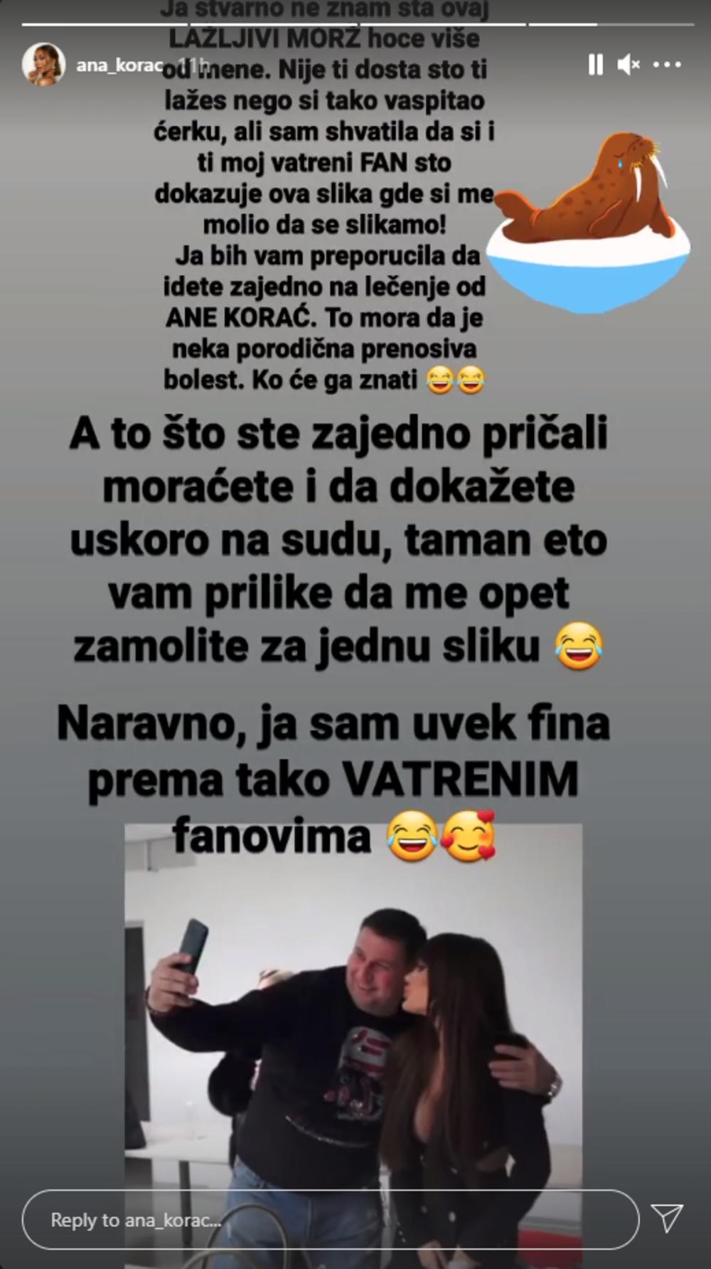 “Ja stvarno ne znam šta ovaj lažljivi morž hoće više od mene. Nije ti dosta što ti lažeš nego si tako vaspitao ćerku, ali sam shvatila da si ti moj vatreni fan što dokazuje ova slika gde si me molio da se slikamo! Ja bih vam preporučila da idete zajedno na lečenje od Ane Korać. To mora da je neka porodična prenosiva bolest. Ko će ga znati. A to što set zajedno pričali moraćete da dokažete uskoro na sudu, taman eto vam prilika da me opet zamolite za jednu sliku. Naravno, ja sam uvek fina prema tako vatrenim fanovima!”