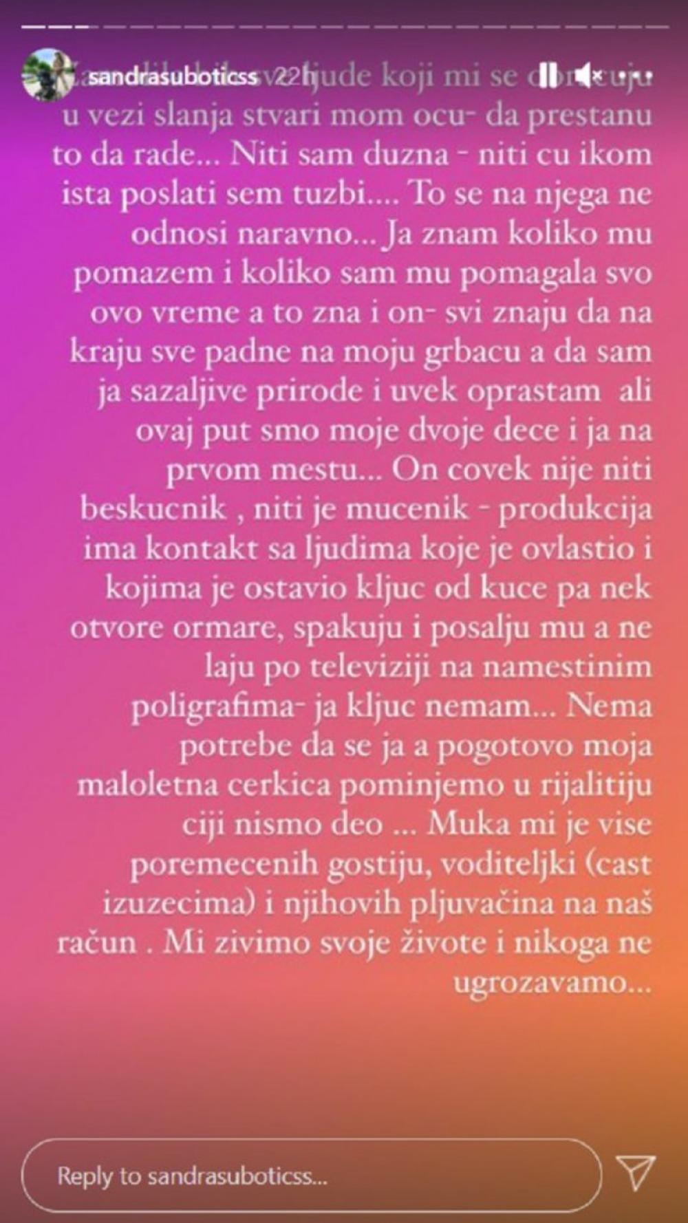 - Za sve ljude koji mi se obraćaju u vezi slanja stvari mom ocu: da prestanu to da rade. Niti sam dužna, niti ću ikom išta poslati sem tužbi. To se na njega ne odnosi naravno. Ja znam koliko mu pomažem i koliko sam mu pomagala sve ovo vreme, a to zna i on. Svi znaju da na kraju sve padne na moju grbaču, a da sam ja sažaljive prirode i da uvek opraštam, ali ovaj put smo moje dvoje dece i ja na prvom mestu. On čovek nije niti beskućnik, niti mučenik. Produkcija ima kontakt od osobe koju je ovlastio i koja ima ključ od kuće, pa nek otvore ormare, spakuju sve i pošalju mu, a ne da laju po televiziji po lažnim poligrafima. Ja ključ nemam. Nema potrebe da se ja, a pogotovo moja maloletna ćerkica spominjemo u rijalitiju čiji nismo deo. Muka mi je više od poremećenih gostiju, voditeljki (čast izuzecima), i njihovih pljuvačina na naš račun. Mi živimo svoje živote i nikog ne ugrožavamo - zaključila je Subotićeva.