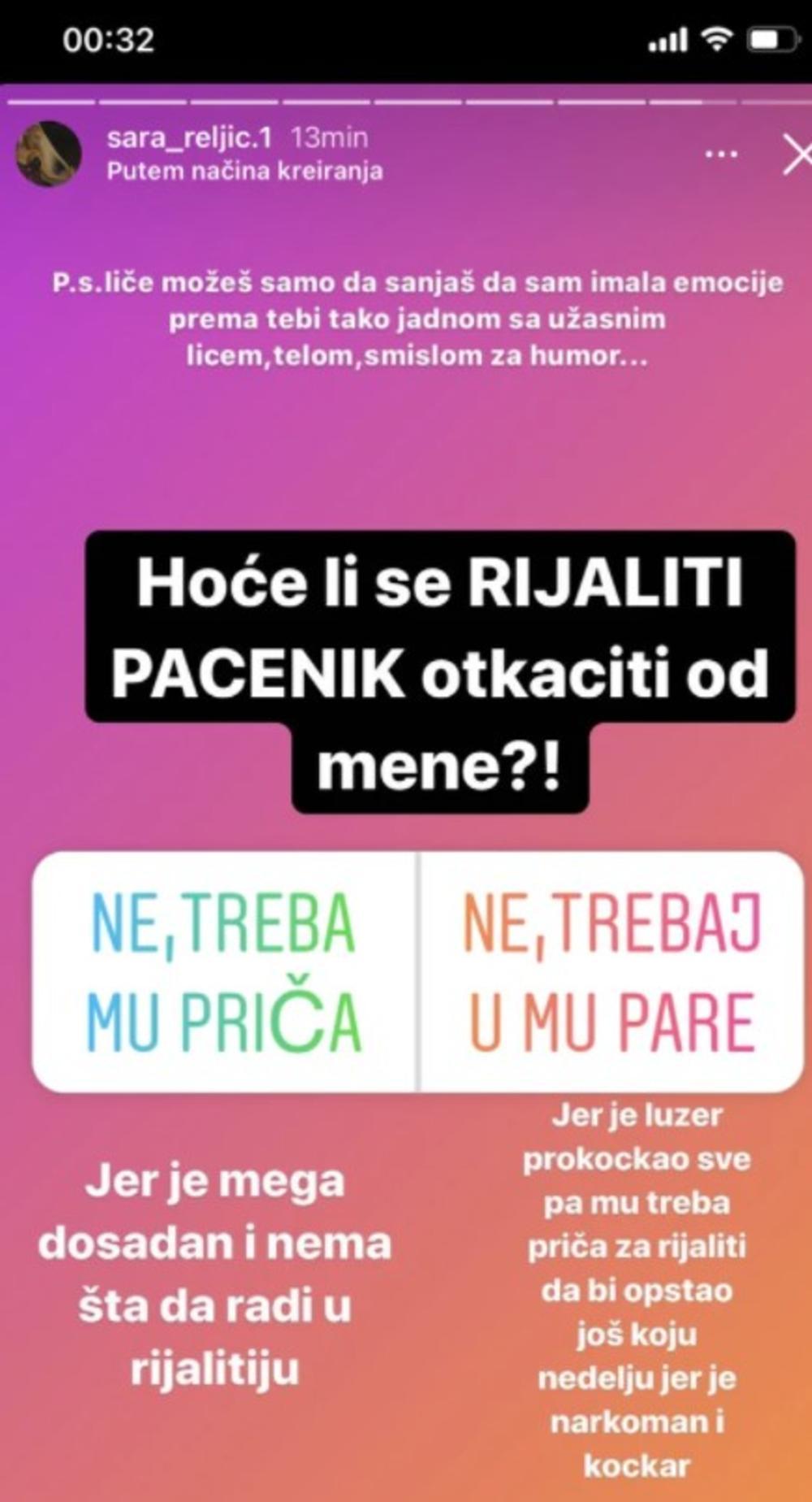 - Hoće li se rijaliti paćenik otkačiti od mene?! Liče, možeš samo da sanjaš da sam imala emocije prema tebi tako jednom sa užasnim licem, telom, smislom za humor...! - napisala je Sara i postavila anketu.