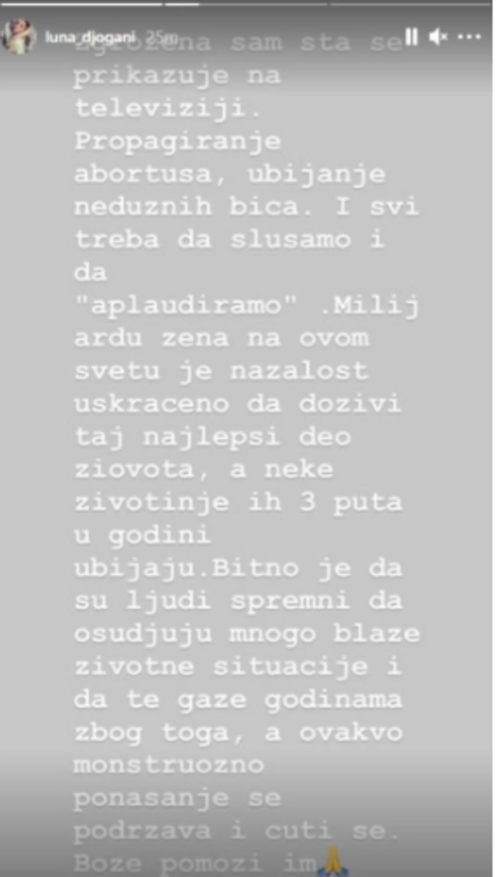 Zgrožena sam ubijanjem nedužnih bića i abortusa. Sada svi treba da slušamo i da "aplaudiramo". Milijardu žena na ovom svetu je uskraćeno da doživi taj najlepši deo života, a neke životinje ih 3 puta u godini ubijaju. Bitno je da su ljudi spremni da osuđuju mnogo blažeživotne situacije i da te gaze godinama zbog toga, a ovakvo monstuozno ponašanje se podržava i ćuti se. Bože pomozi im - napisala je Luna, pa dodala: