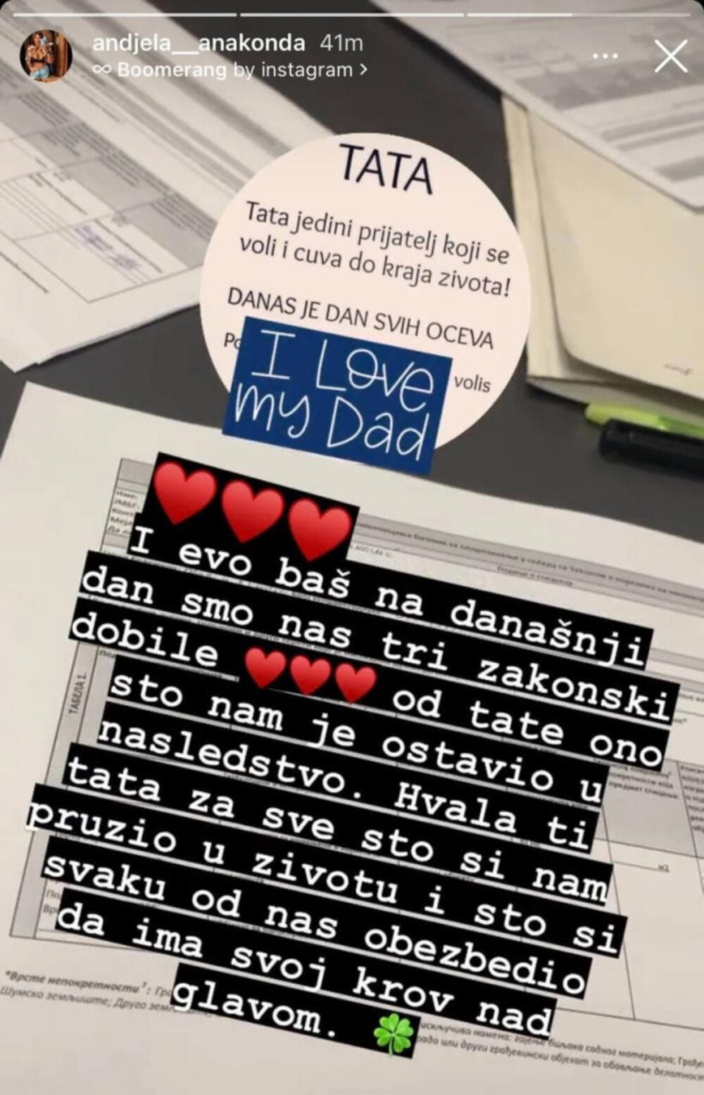 - I evo baš na današnji dan smo nas tri zakonski dobile od tate ono što nam je ostavio u nasledstvo. Hvala ti tata za sve što si nam pružio u životu i što si svaku od nas obezbedio da ima krov nad glavom - napisala je Anđela na svom Instagram profilu.
