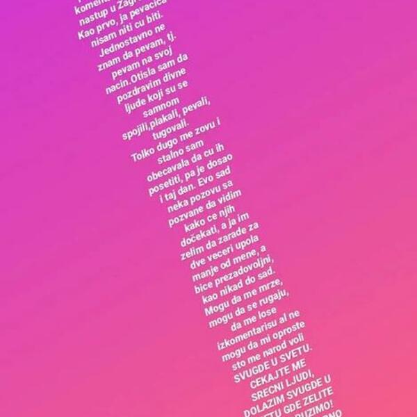 - Dragi moji prijatelji, samo su se pronašli ljubomorni, iskompleksirani i neuspesi u svakom pogledu, pa su komentarisali moj nastup u Zagrebu. Kao prvo, ja nisam pevačica niti ću biti. Jednostavno, ne znam da pevam, to jest, pevam na svoj način. Otišla sam da pozdravim divne ljude koji su se sa mnom spojili, plakali, pevali, tugovali. Toliko dugo me zovu i stalno sam obećavala da ću ih posetiti, pa je došao i taj dan. - piše pa nastavlja: