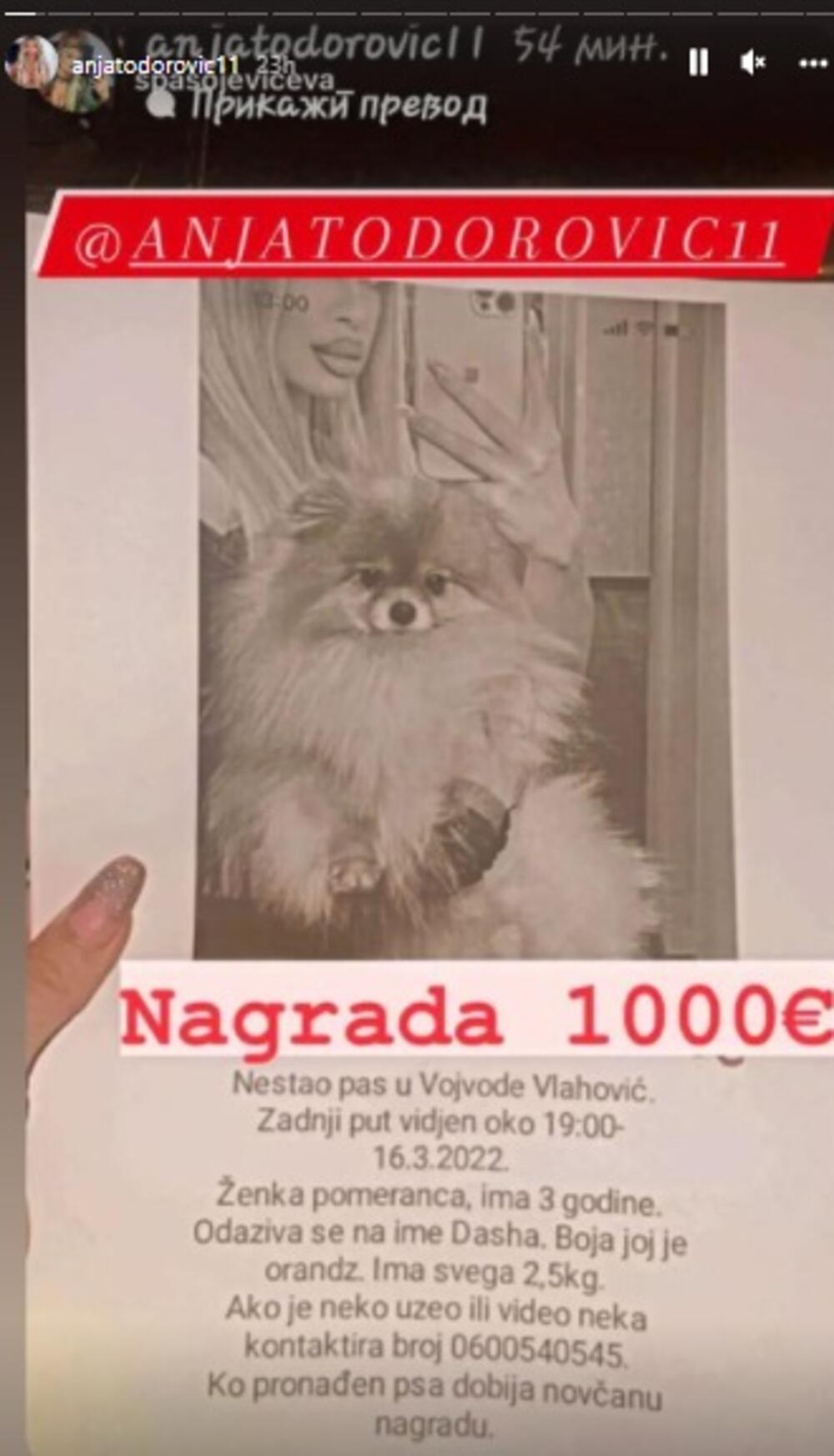 Ona je na svom Instagram profilu objavila da joj je nestao pas, a kao nagradu je ponudila 1.000 evra, da bi zatim povećala na 3.000evra.