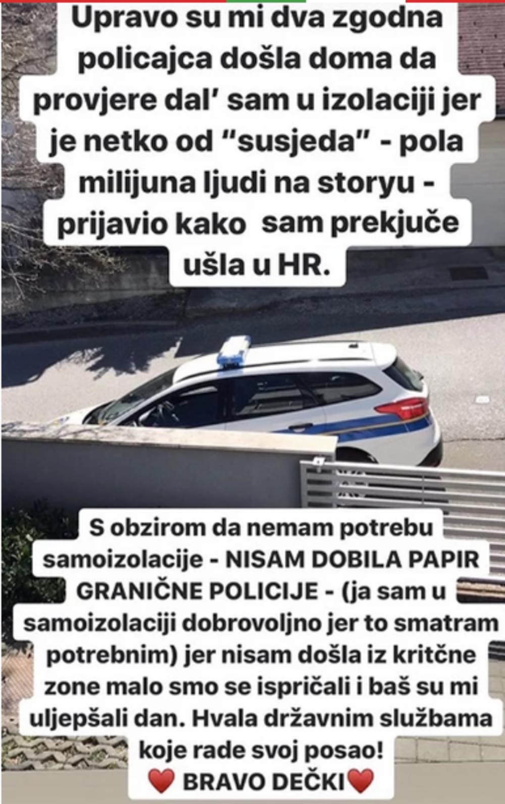 - Upravo su mi došla dva zgodna policajca da provere da li sam u izolaciji, jer je neko od "komšija" - pola miliona ljudi na storiju - prijavio kako sam prekjuče ušla u Hrvatsku. S obzirom na to da nemam obavezu samoizolacije, nisam dobila papir granične policije (ja sam u samoizolaciji dobrovoljno jer to smatram potrebnim), jer nisam došla iz kritične zone, malo smo se ispričali i baš su mi ulepšali dan. Hvala državnim službama koje rade svoj posao. Bravo momci - poručila je voditeljka.