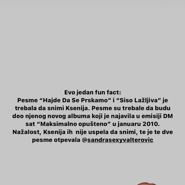 "Pesma se zove "Si*so lažljiva". Ona je bila napisana za pokojnu Kseniju Pajčin. Skroz je u njenom fazonu. Međutim, desilo se to što se desilo pa sam je kasnije dobila ja, pošto niko nije imao m*da da je otpeva", zaključila je Sandra 2016. godine.