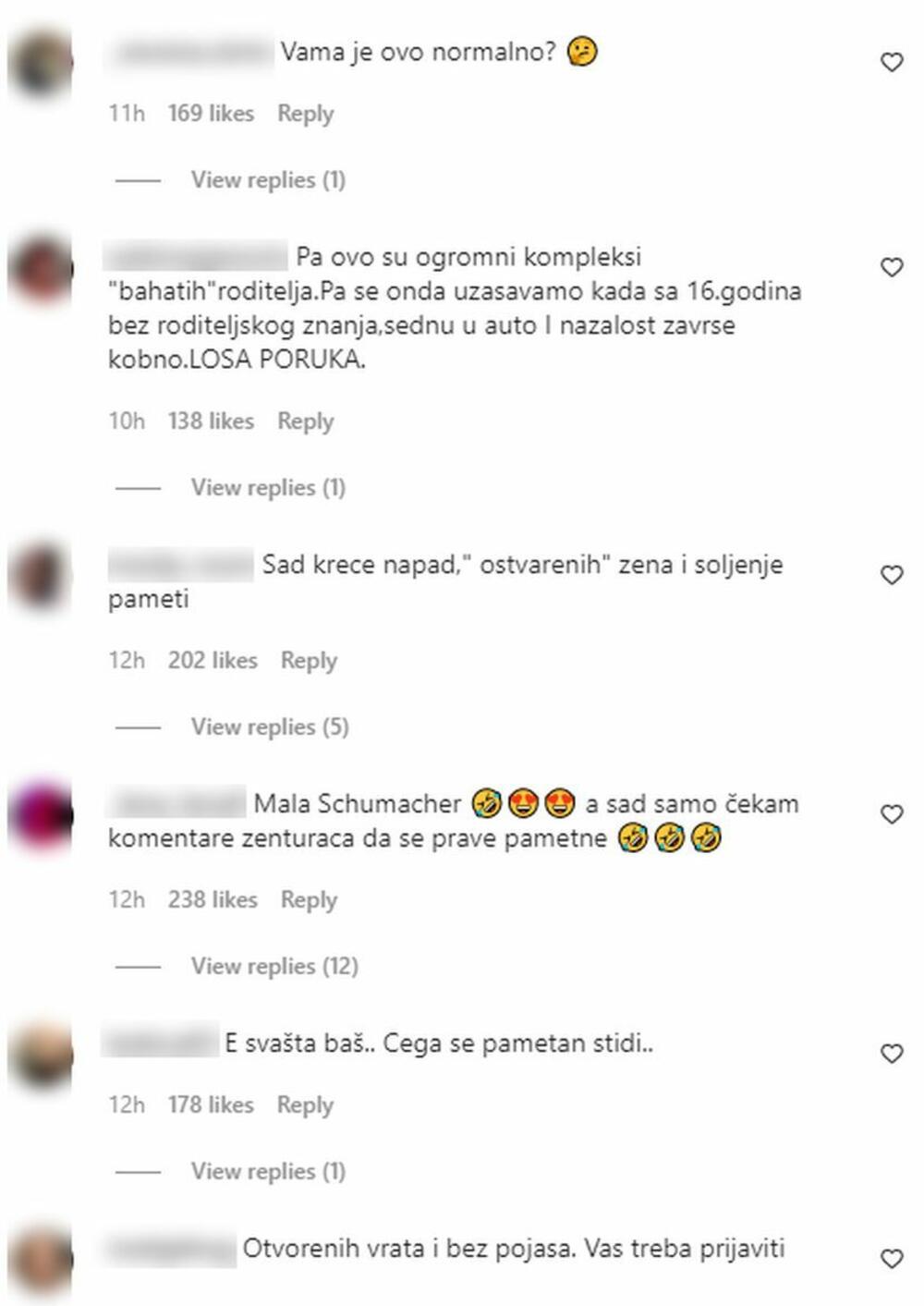 "Svi je napadate, a Nikola je taj koji je ćerki dao auto, vidi se odraz kako trčkara", "Mene interesuje, s obzirom na to da ima tri papuče, znači manuleac, šta je on to ubacio auto u prvu i oustio dere da se vozi?", "Treba da živi, sve po redu, a ne tako", "Sramota bi bilo da ovo prođe nekažnjeno", "Meni ste simpa, ali mislim da ovo nije okej", "Šta vam je ljudi, i mene je ćale učio da "vozim" kad sam bila mala", "Nije okej da tata dete izlaže opasnosti", neki su od komentara.