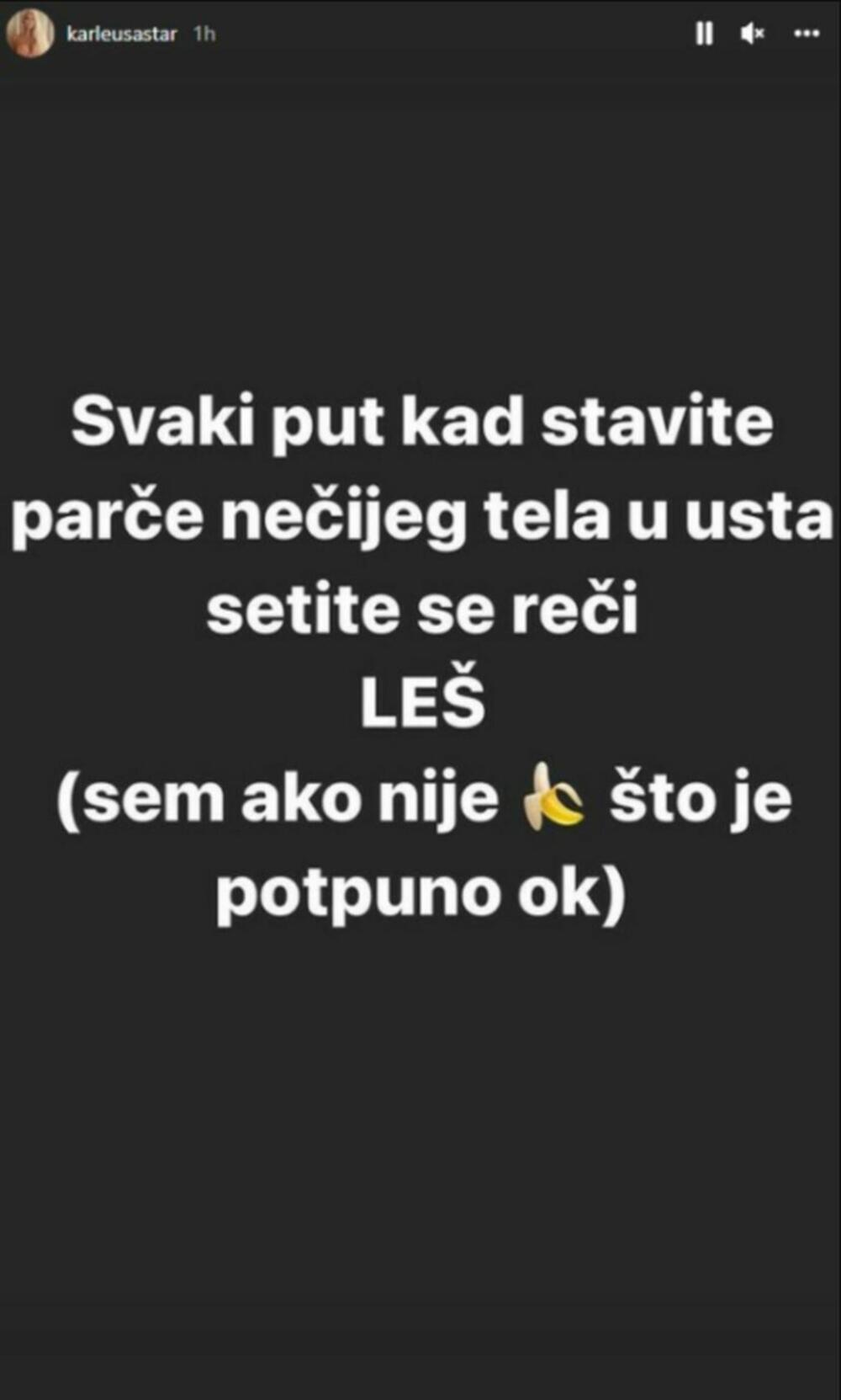 - Svaki put kada stavite parče nečijeg tela u usta, setite se reči leš (Sem ako nije banana, što je potpuno okej) - napisala je Karleuša.