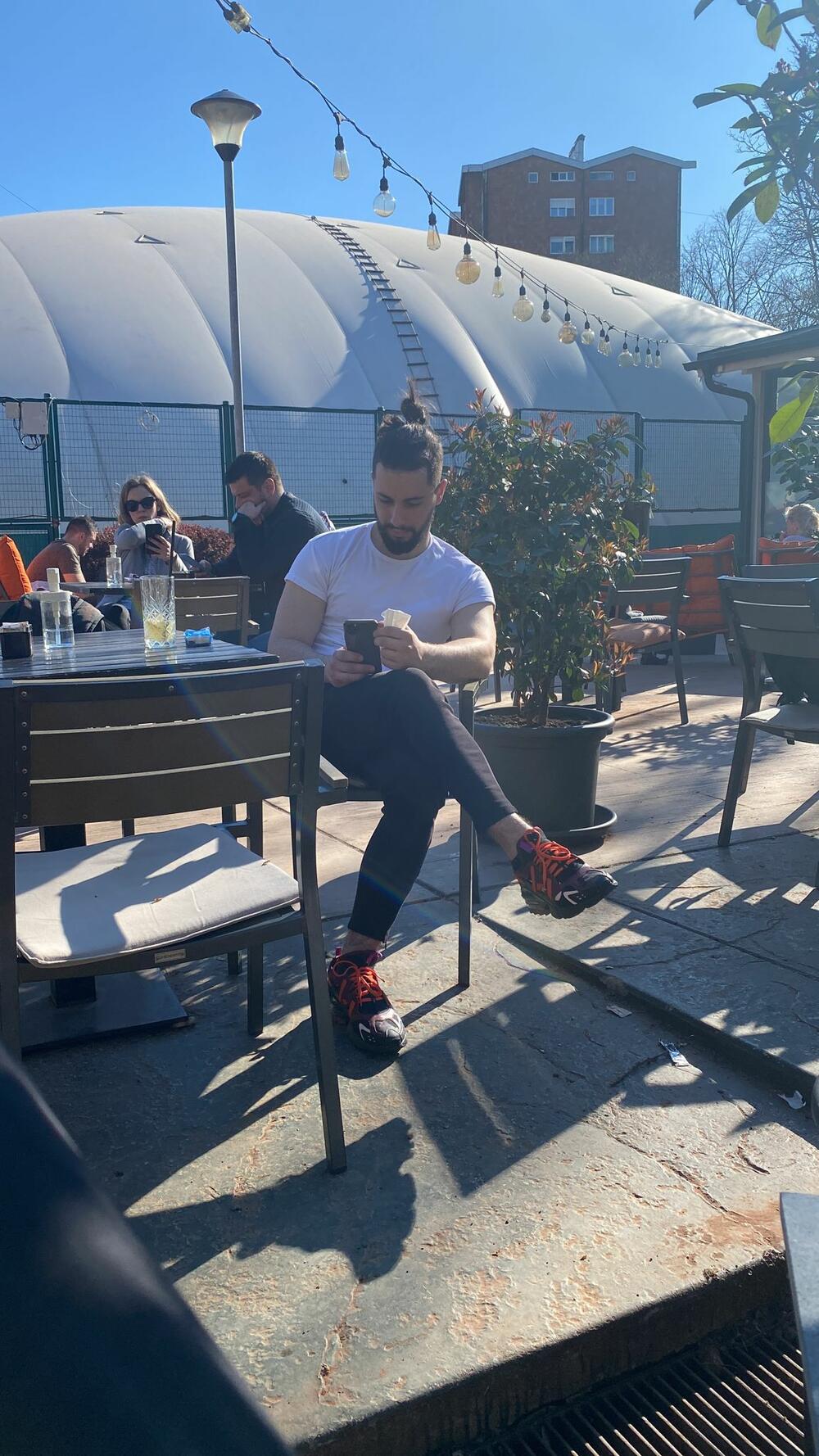Voditelj i bivši zadrugar Stefan Kandić Kendi i dok je u bašti jednog kafića on ne može da se odvoji od svog mobilnog telefona. Moguće je da zapravo ne može da se opusti jer priprema nove emisije šoua "Pitam za druga". Danas je u gradu bilo toplije nego prethodnih dana, što je Kendija obradovalo jer je konačno mogao da se otarasi tople zimske garderobe, pa je pored pantalona nosio i majicu kratkih rukava.