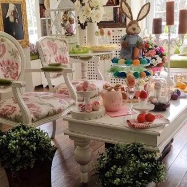Čajnik roze boje, veliki zec na postolju, belo-roze jaja, čuvarkuća i stakleni poklopac izgledaju kao iz snova