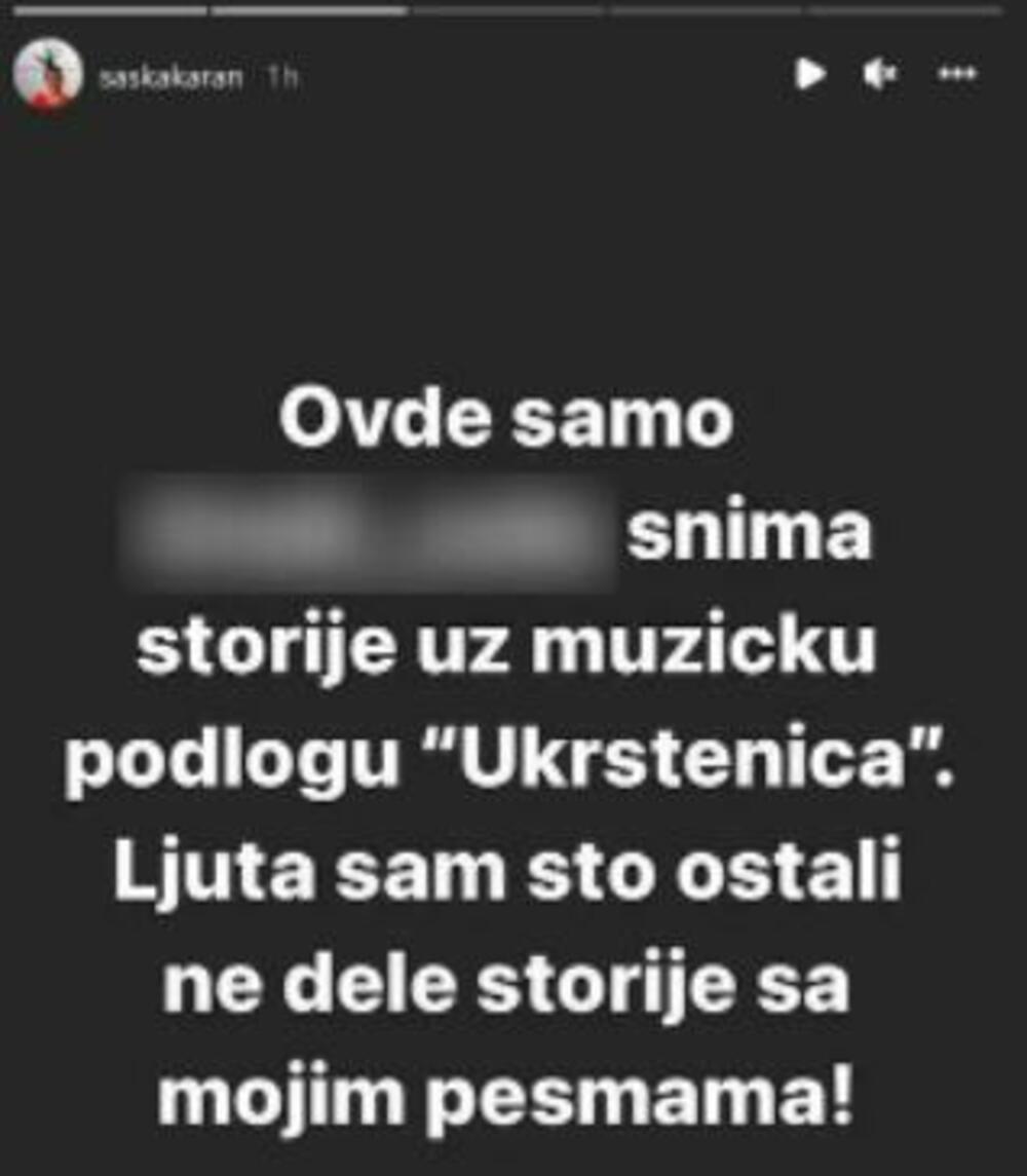 - Ovde samo jedan moj pratilac snima storije uz muzičku podlogu "Ukrštenica". Ljuta sam što ostali ne dele storije sa mojim pesmama - poručila je otvoreno Saška.