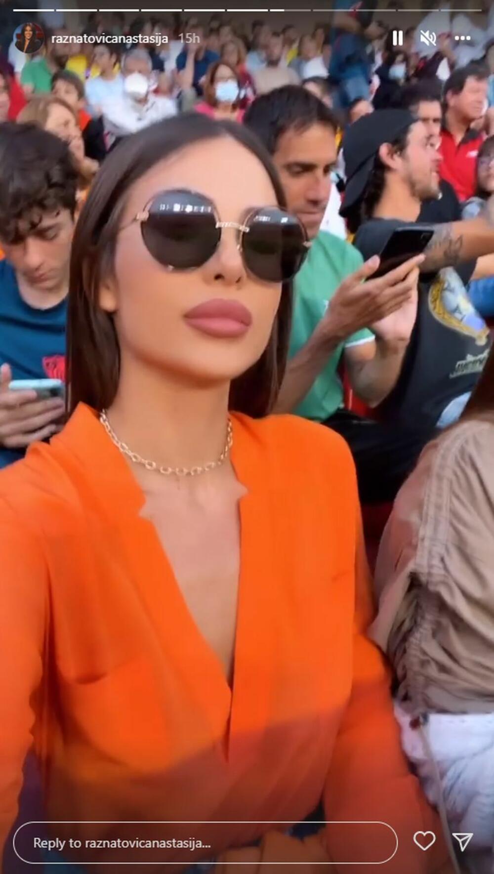 Naime, Anastasija je sa svojim pratiocima na Instagramu podelila video sa tribina, u prvom planu bila je ona, a onda je i pokazala delić atmosfere sa stadiona.